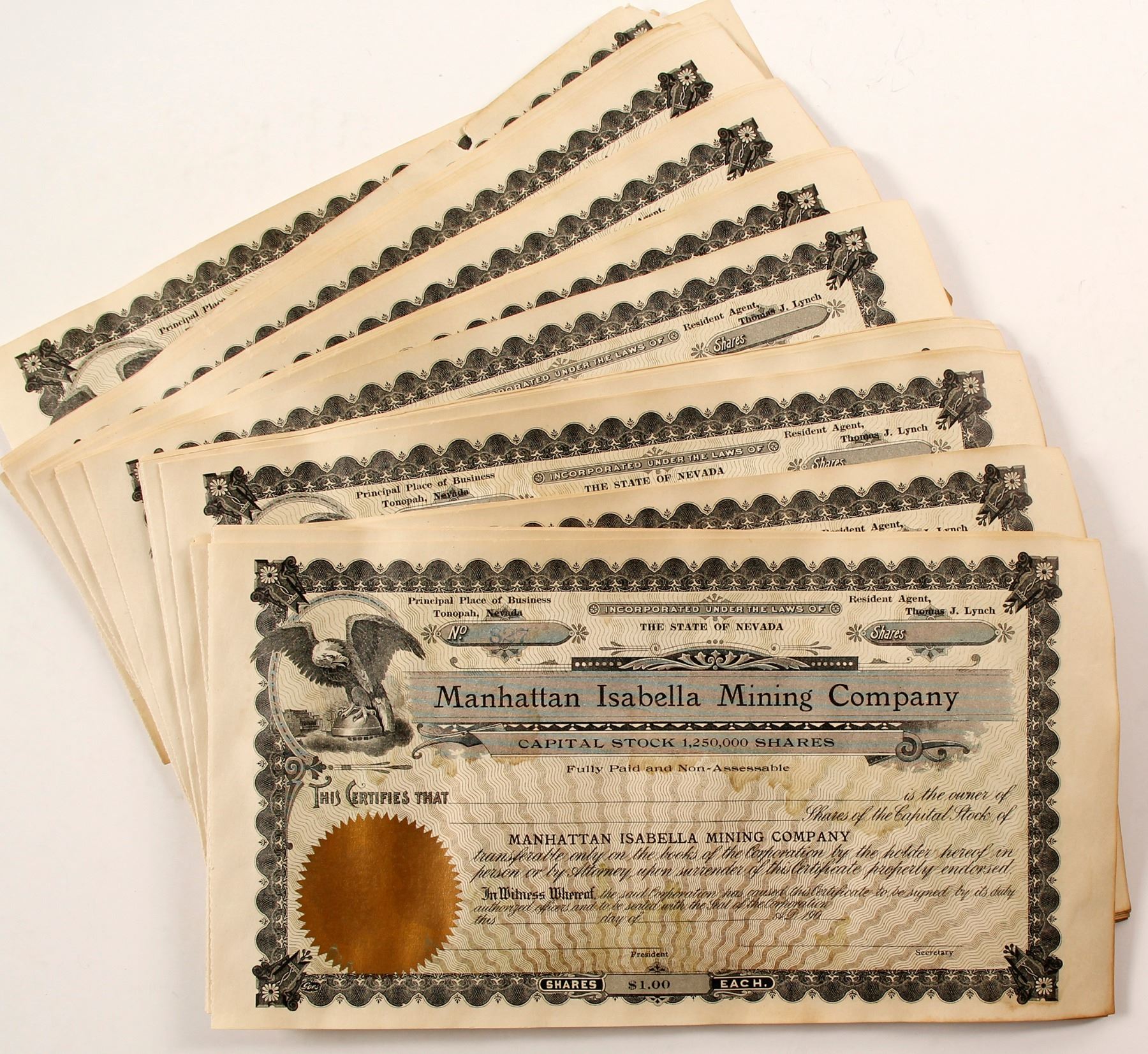 Lot of 75 unissued stock certificates. Principal Place of Business: Tonopah, Nevada. Resident AgentL Thomas J. Lynch. Ornate border, gold seal, and eagle vignette. 5.5 x 10.25" Water staining, toning, associated wrinkling/folds. Not listed in Copper Handbooks (1906-08).