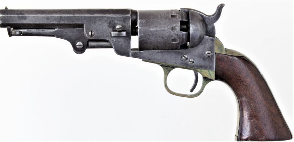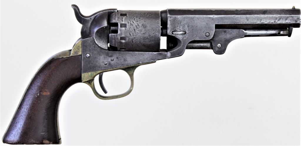 Manhattan Navy .36 cal SN 55969 5 shot percussion revolver type 4 with 4 1/2" barrel blued finish and one piece walnut grips. Good overall the revolver with matching serial numbers on barrel, frame, wedge, trigger guard, arbor and backstrap, steel surfac5 shot percussion revolver type 4 with 4 1/2" barrel blued finish and one piece walnut grips. Good overall the revolver with matching serial numbers on barrel, frame, wedge, trigger guard, arbor and backstrap, steel surfaces show anuncleaned silver gray patina, good cylinder scene and crisp barrel address, brass dark mustard with area of tarnish. Walnut grips are very good some light dins on bottom edges. Action and mechanics are tight and function nicely, bore with verylight scattered pin prick pitting but surprisingly good overall. Made from 1859-1868 to compete with Colts 1851. De Accessioned from a state of AZ Museum. Antique/ NO FFL. Est. 450-800
