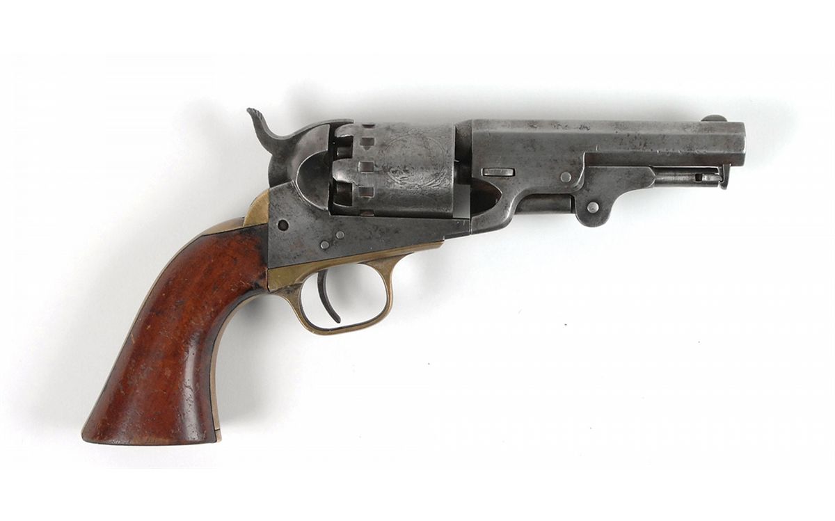 Manhattan ‘Navy Type’ Percussion Revolver, #3233, .36 cal, 4? barrel, dark bore with good rifling. All numbers on the metal match, including the wedge. This has the six-shot cylinder. The iron has a light gray patina with about 50% of the cylinder scene remaining and a clear barrel address. The brass gripstraps have a dark bronze color with the one-piece walnut grip showing only light wear. The wedge screw is a replacement and the mechanism work well.
