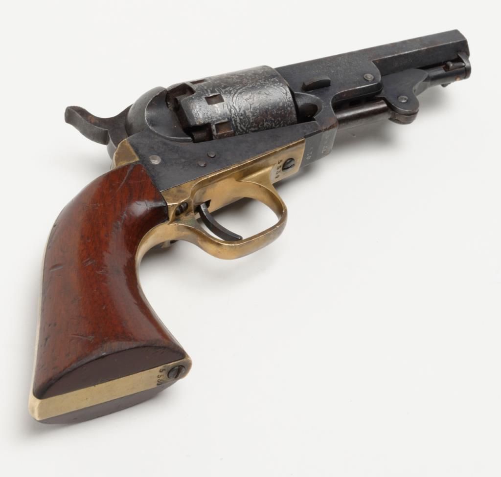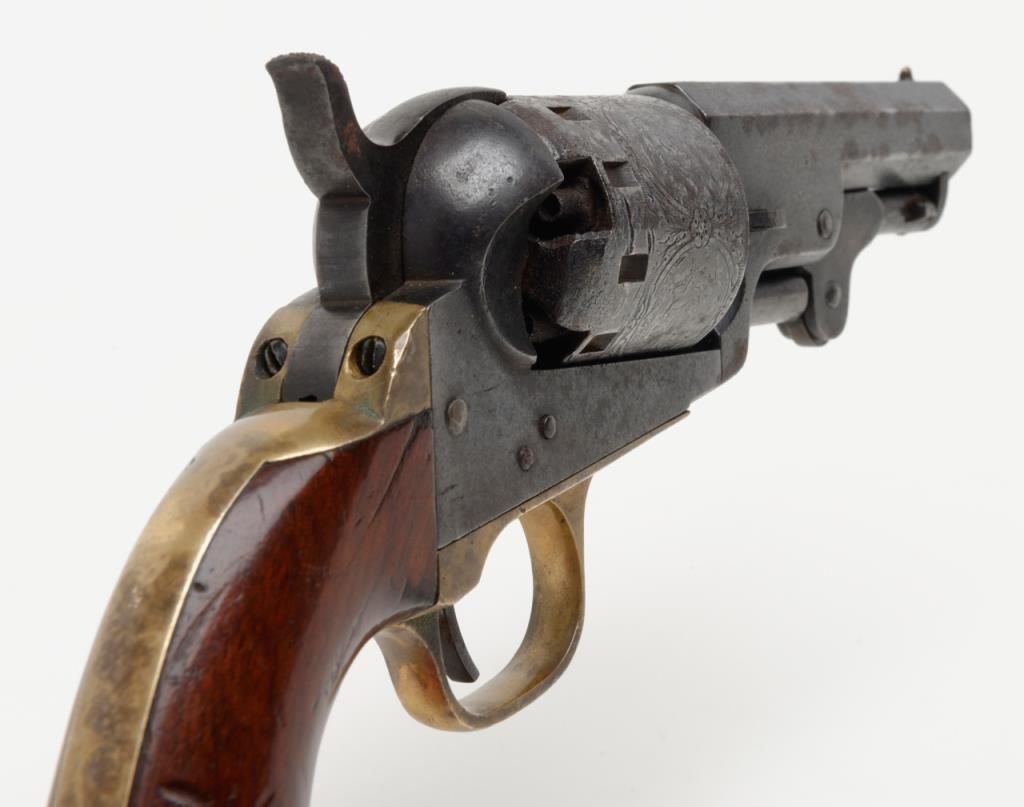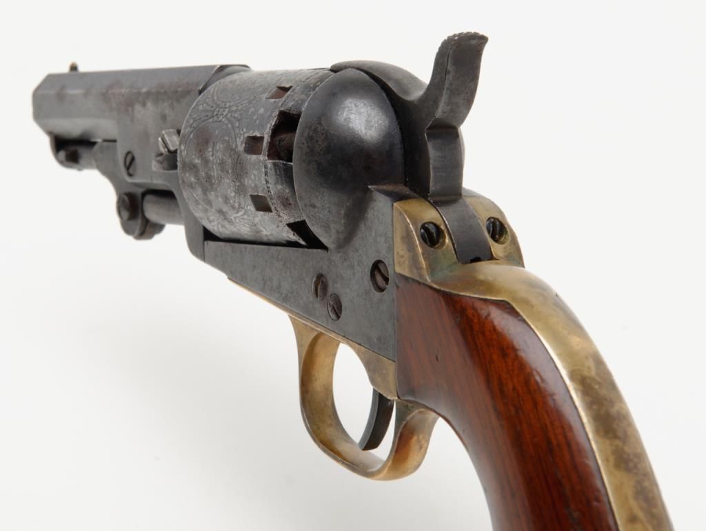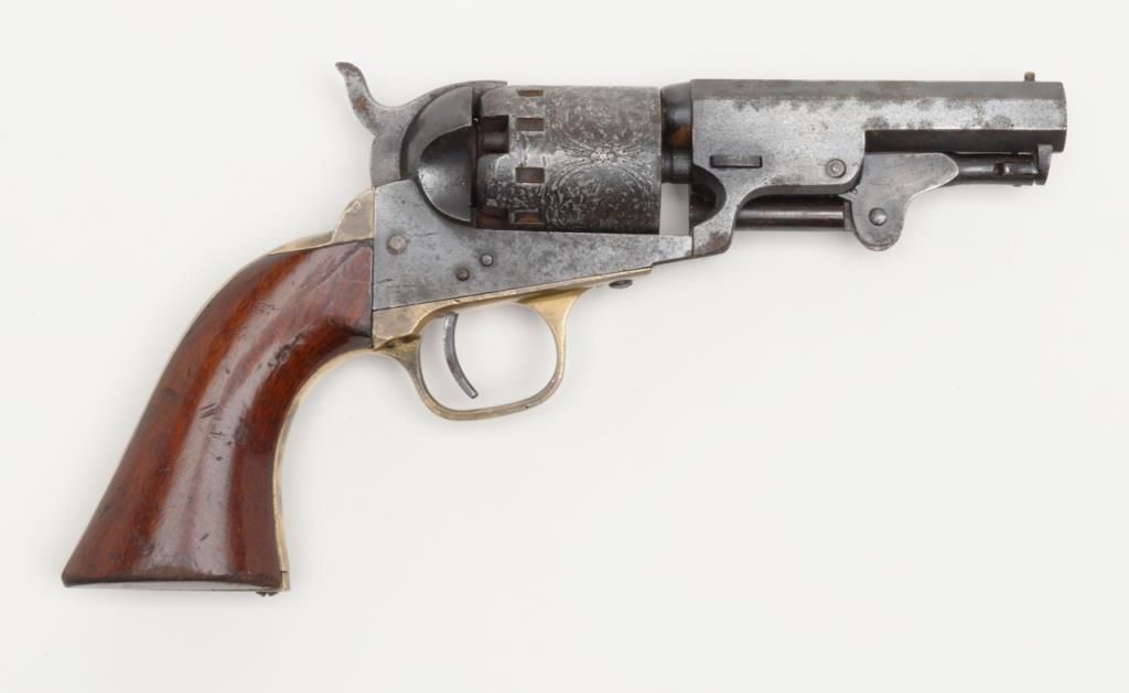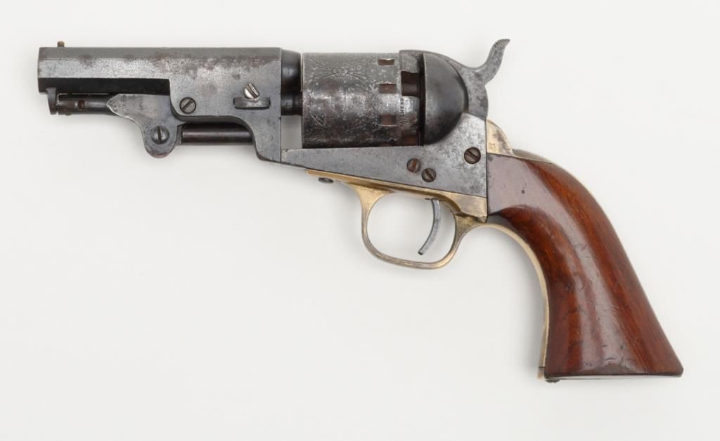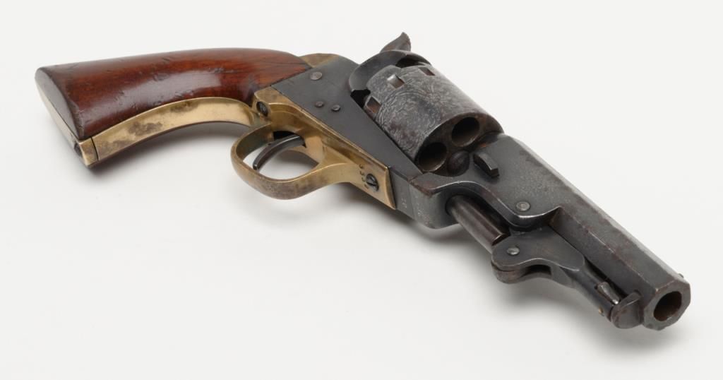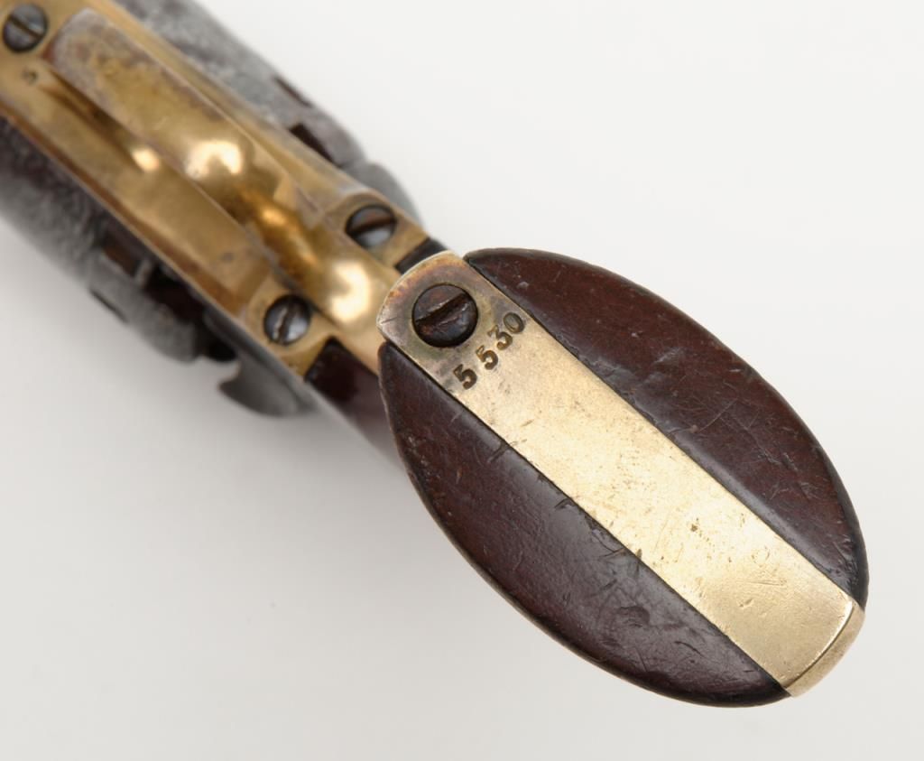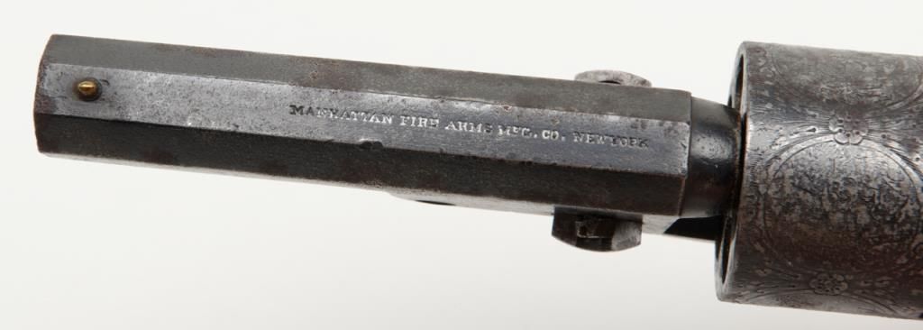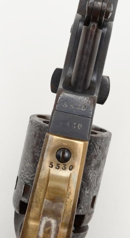 Manhattan “Navy Type” percussion revolver, .36 cal., 3-1/2” octagon barrel, blue and case hardened finish, brass straps, wood grips, #5530 in overall very good condition showing dark patina mixed with blue and scattered spots of erosion,majority of original cylinder scene, crisp action, sharp markings and very good grips showing considerable original finish, with some wear and minor old mars from carry and storage; wedge screw is missing portion of head. (Antique). Est.: $700-$1,400.
