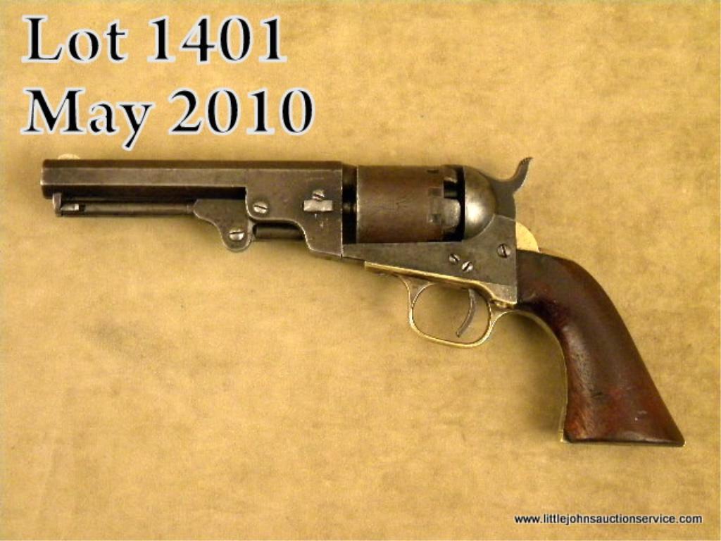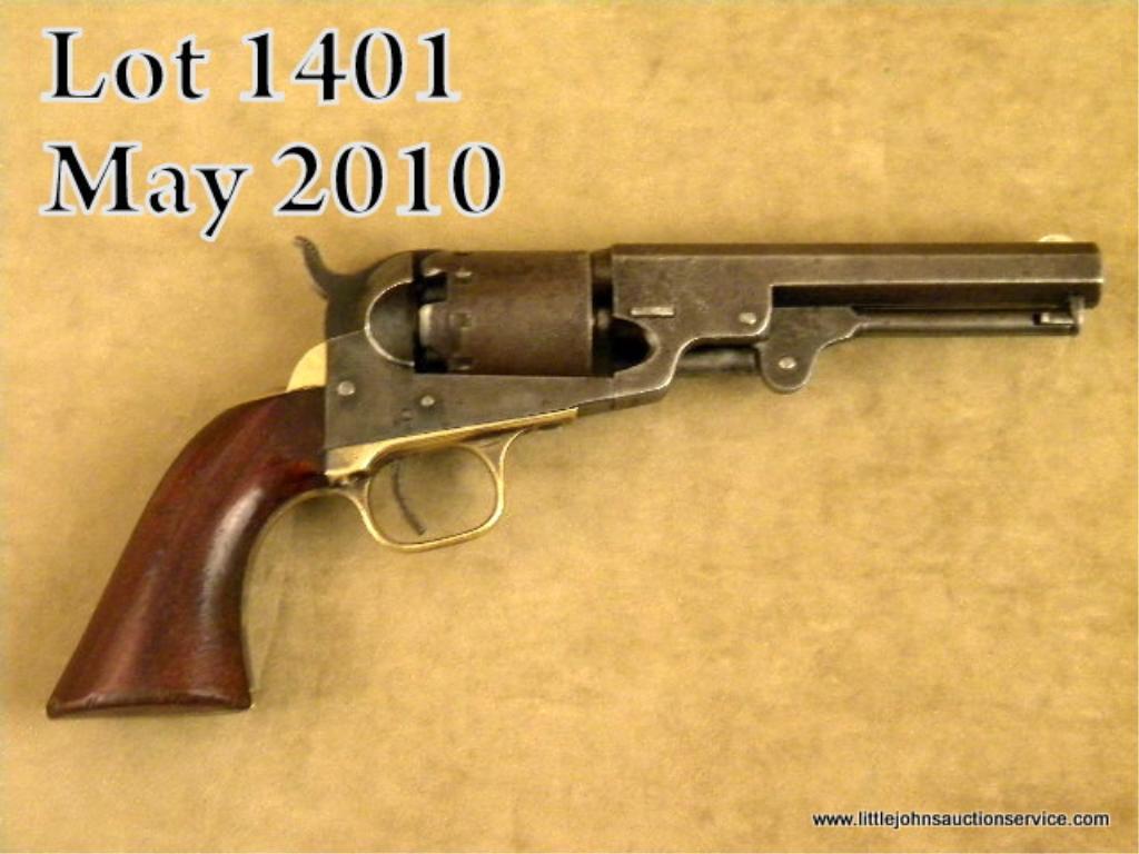 Manhattan “Navy type” percussion single action revolver, .36 cal., 5” octagon barrel, blue and case hardened finish, brass straps, wood grips, #28454. This gun is in overall very good condition showing traces of original blue and case colorswith balance of metal surfaces gone to a grey patina with some scattered spots of erosion and pin prick pitting; most of the cylinder scene is remaining and visible, good action, markings and bore, good grips with considerable original finish and some scattered nicks and mars from carry and storage; all matching visible serial numbers. Est.: $600-$1,200.