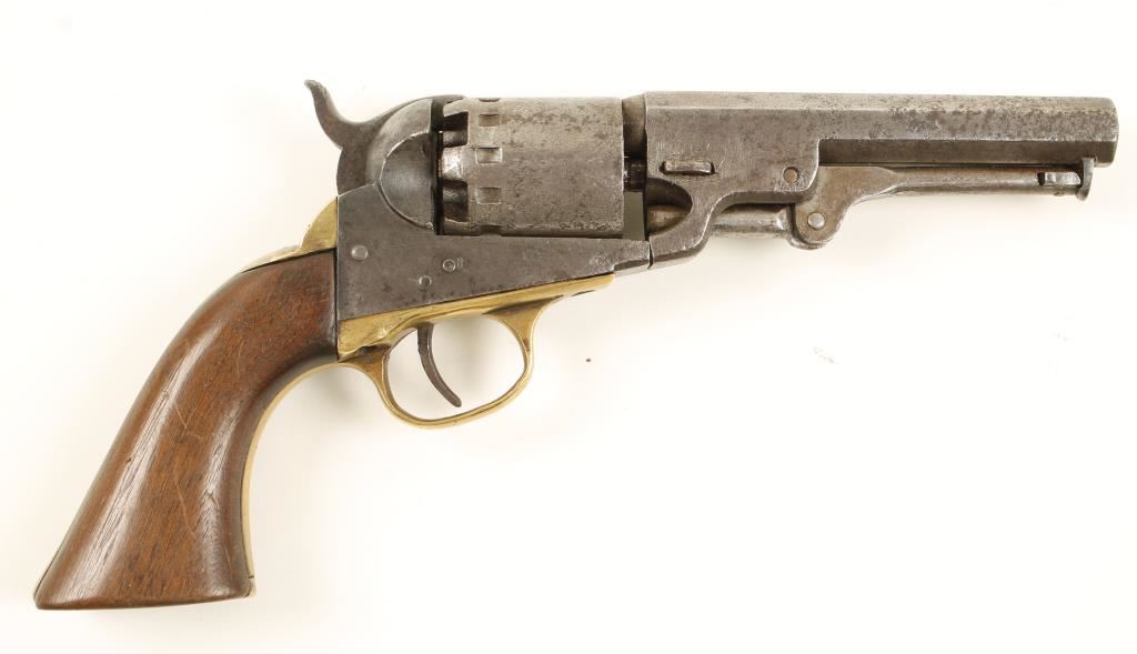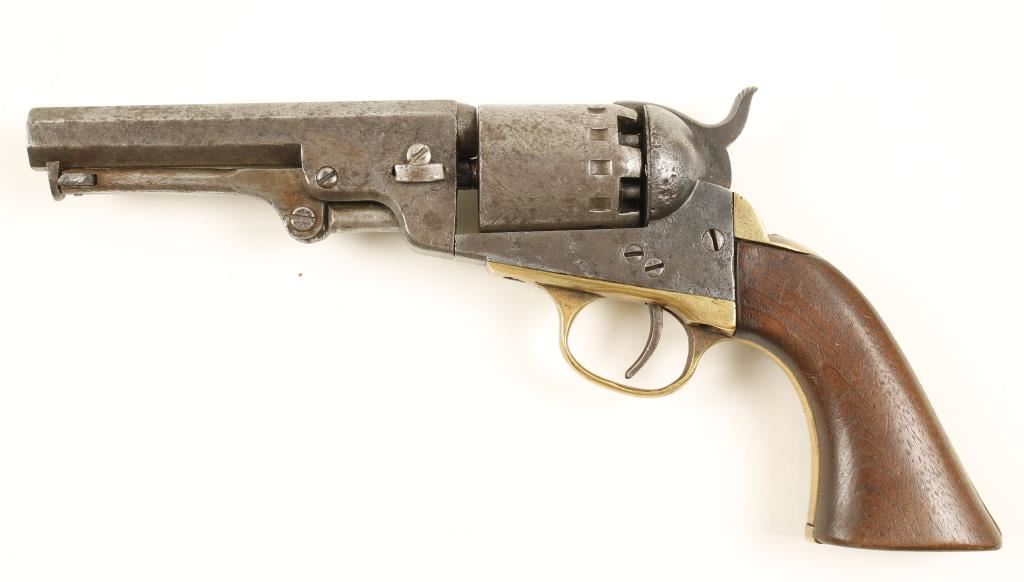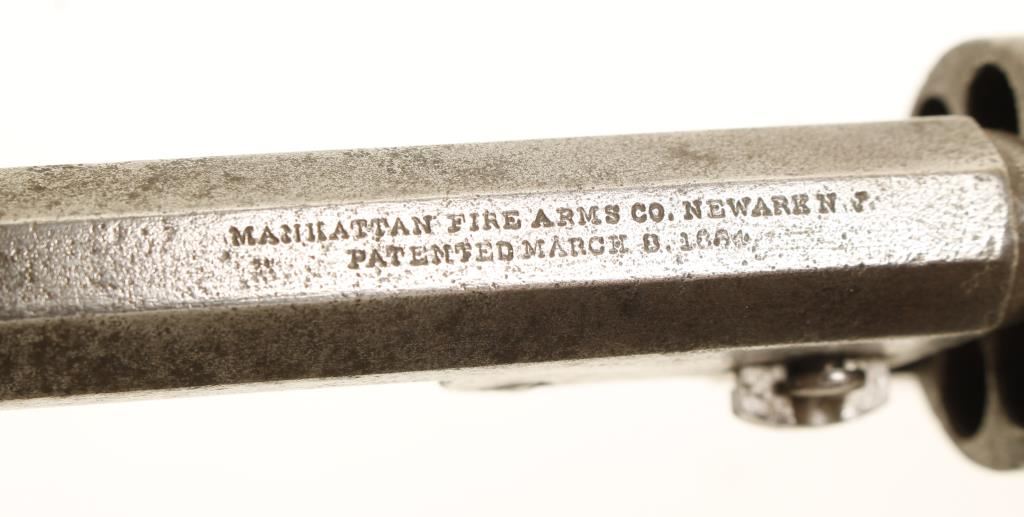 Model IV or Model V. Blued single-action percussion 6-shot open-top revolver with a 4-1/2" barrel. Bluing has gone to grey leaving rust stains and pitting. Cylinder has remnants of engraved ovals and date of Dec. 27, 1859. Double cylinder notches to lock cylinder between chambers. Barrel inscription reads, "Manhattan Firearms Co. Newark, NJ Patented March 8, 1864". All serial numbers match. Brass trigger guard and backstrap have dings and scratches. Bore has visible residual rifling and pitting. Chambers have rust. Wood grips have dings and scratches. Action works well with good lock-up. Condition is fair to good. *Antique Firearm*