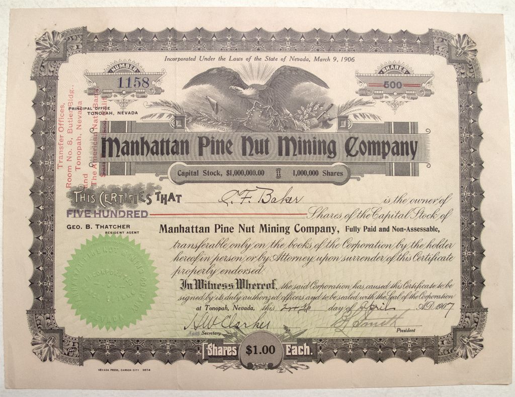 Great name for a Nevada Mining Company. #1158 for 500 shares to CF Baker in 1907. Signed by HW Clarke and BL Smith.