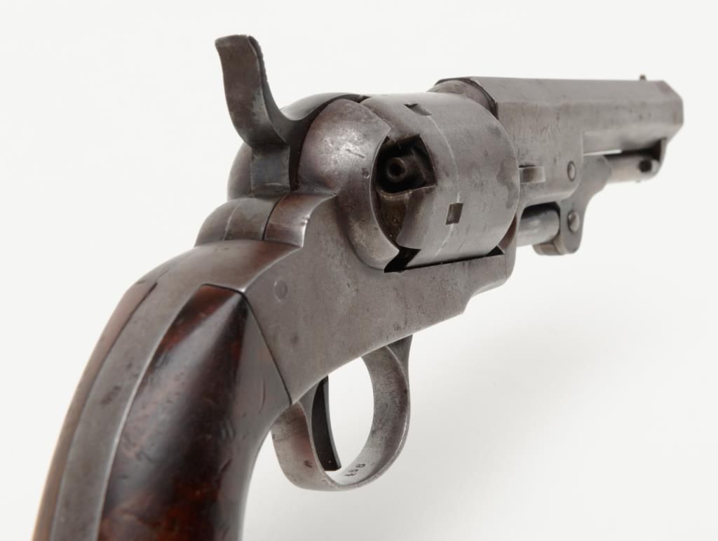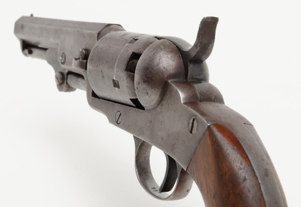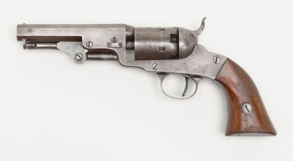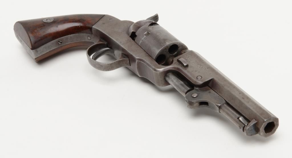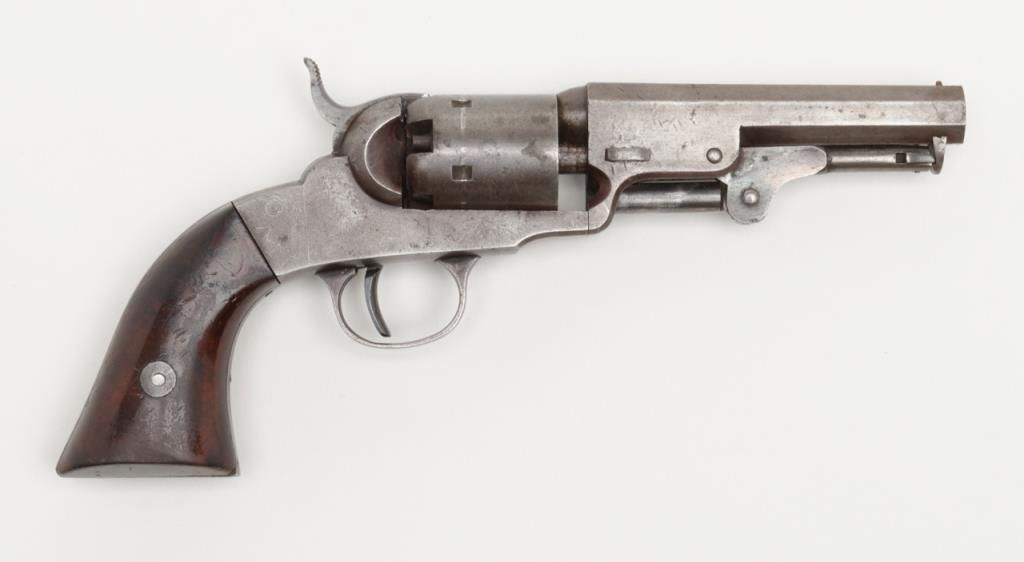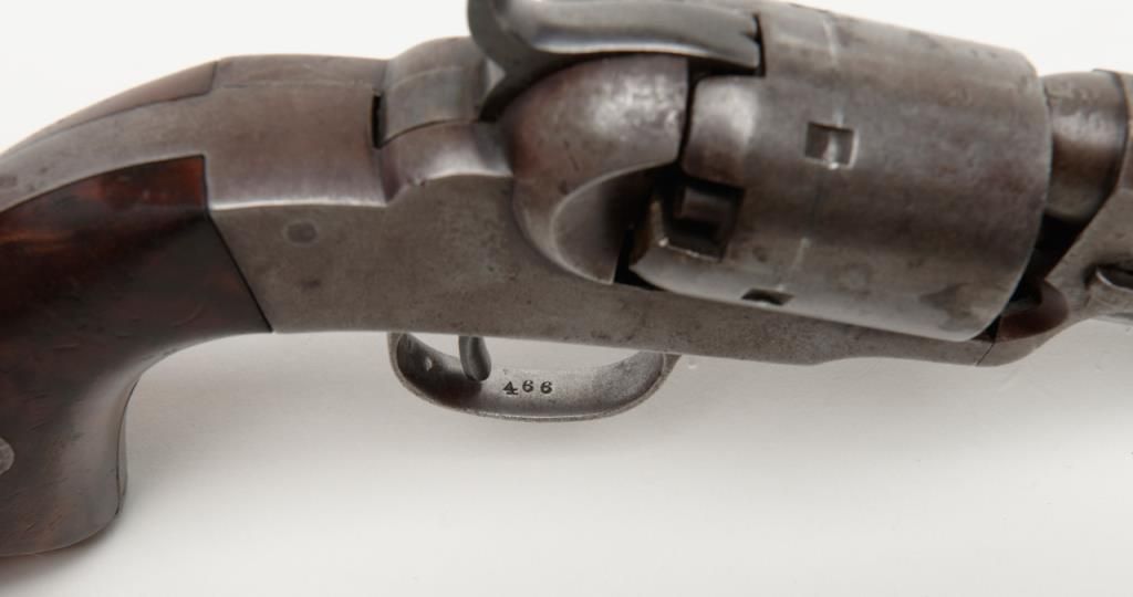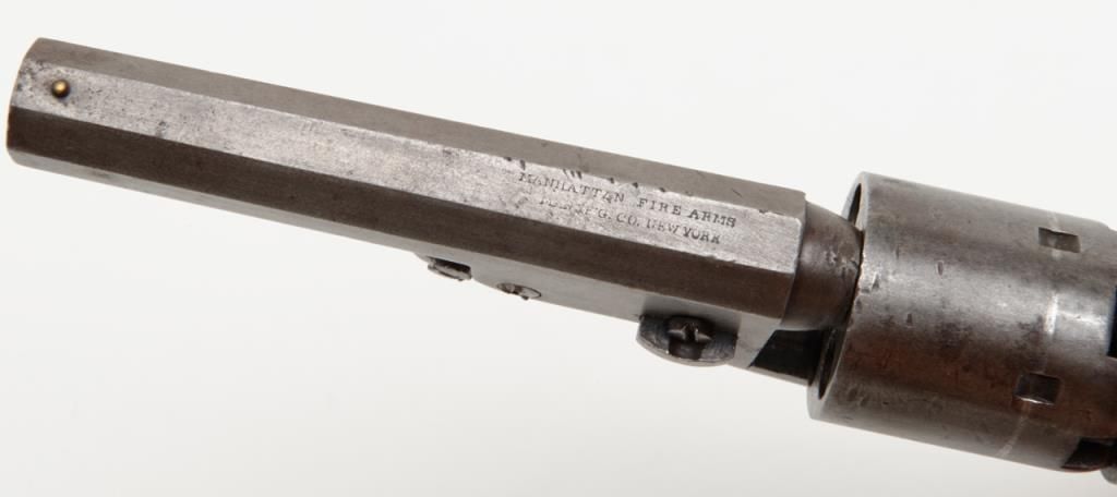 Manhattan Pocket Model percussion revolver, .31 cal., 4” octagon barrel, blue and case hardened finish, wood grips, #466 in overall very good condition showing a grey patina with strong traces of original case colors on the rammer, near finebore, action is crisp but out-of-timing, good barrel address, very good grips. (Antique). Est.: $500-$1,000.
