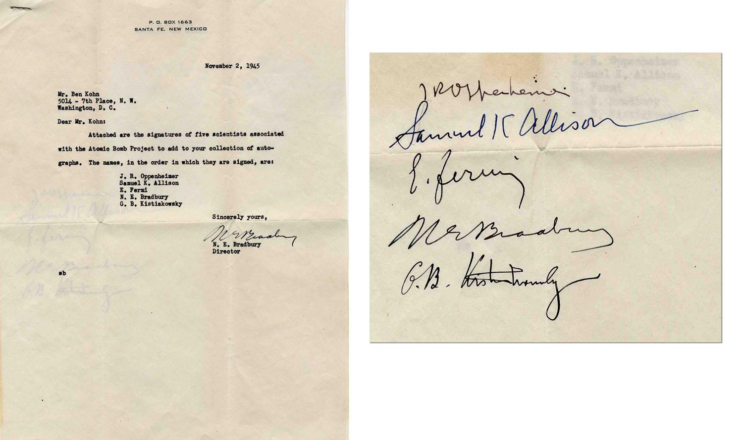 Typed letter signed by Manhattan Project Director Norris Bradbury, who encloses the signatures of the ''five scientists associated with the Atomic Bomb Project.'' On a separate sheet are the promised signatures, written boldly by all: ''J.R. Oppenheimer'', ''Samuel K. Allison'', ''E. Fermi'', ''N.E. Bradbury'' and ''G.B. Kistiakowsky''. Letter dated 2 November 1945 is on official ''P.O. Box 1663 / Santa Fe, New Mexico'' stationery, the secret P.O. Box address used for the project whose physical location was undisclosed. Also includes original mailing envelope postmarked 7 November 1945. Document, measuring 8.5'' x 11'' has some folding from mailing, else near fine.