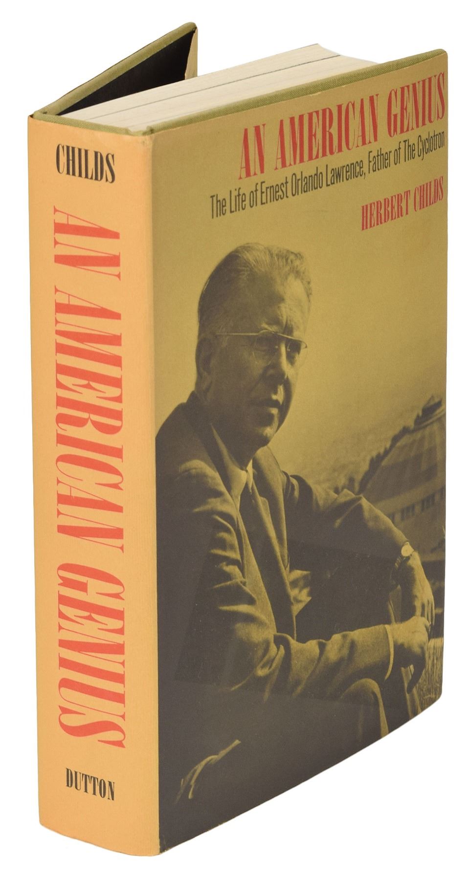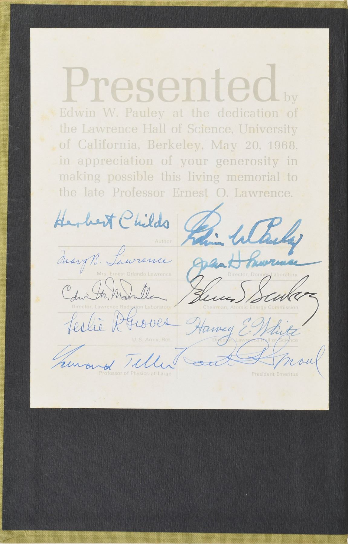 Signed book: An American Genius by Herbert Childs. First edition. NY: E. P. Dutton & Co., 1968. Hardcover with dust jacket, 6.5 x 9.5, 576 pages. Signed on a dedicative bookplate affixed to the front pastedown in various ink types by Edwin McMillan, Leslie R. Groves, Edward Teller, Glenn T. Seaborg, Edwin W. Pauley, author Herbert Childs, and others involved with the dedication of the Lawrence Hall of Science at the University of California, Berkeley, on May 20, 1968. In fine condition.