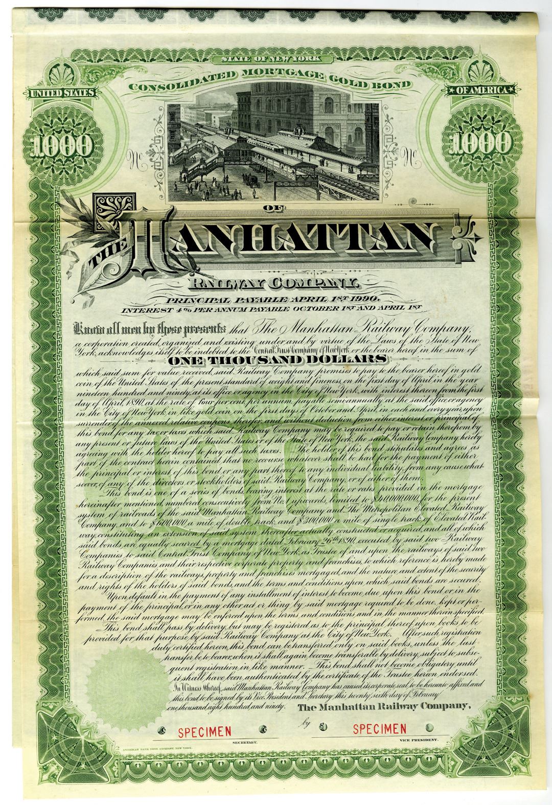 New York. 1890, Manhattan Railway Co., $1000 Specimen 4% Coupon Bond, Black on green border and underprint, View of above ground railroad on busy street over ornate title, Coupons attached. VF condition. ABNC.