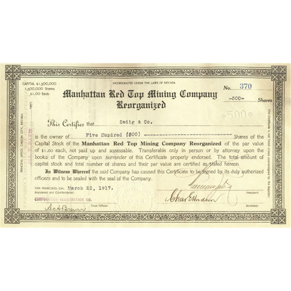 Stock certificates from the United States and other countries around the world. Items offered cover a wide variety of collecting topics including automotive, railroads, mining, autographed and much more.