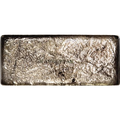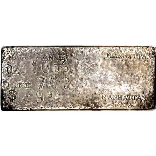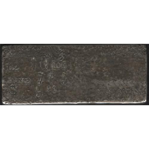 <B>Manhattan Silver Ingot.</B></I> This description and opinion was written by Fred Holabird. The Manhattan silver bar is punched "Manhattan" on the reverse, and "Manhattan" punched three times on the obverse, 10 2/100, 765 Fine, $9.91. There are no assay chips. The bar has been filed on both ends longitudinally at the reverse edge.<BR> It is difficult to render an opinion about this ingot. As a result, we will discuss the positive attributes, as well as certain things which are out of the ordinary. None of these things, either separately, or in conjunction with each other, are enough for me to render an opinion within a 95% realm. Many ingots that are seen today are different from the norm. As research into the field deepens, avenues that were once considered closed, suddenly open with great reason. Thus scientists must keep their minds open when ingots of this nature surface, particularly when the obvious is not apparent.<BR> Often specific ingot attributes are simply a commonality of the person or company policy punching the markings. Certainly all of the Kellogg-Humbert ingots of the <I>S.S. Central America</B></I> and successor companies punched their ingots similarly. The same holds true for assayers such as Conrad Weigand of San Francisco and Virginia City, as well as H. Harris. This ingot displays some characteristics that we have seen in ingots from the Reese River period. But it also has things that are atypical.<BR><BR><B>Positive attributes:</B></I><BR> The punch patterns on the ingot show strong similarities to other ingots of the early period, particularly the period circa 1868-1879. Specifically, the OZ, FINE, and dollar sign are consistent with other bars.<BR> The word "Manhattan" is a single gang punch. This is typical of any mining company punch, especially those who regularly produced ingots.<BR><BR> <B>Inconsistencies:</B></I><BR> Few original ingots have filed or shaved ends. What purpose can this attain?<BR> Few original ingots carry the mine or company name more than once on a side. The only possible explanation for this if it is original, is that it was used for display or "Exhibition" purposes.<BR> Few original ingots have the mine or company name punched on both sides.<BR> There is no assay chip or chips. The lack of these could be due to the nature of the ingot, if it were used as an exhibition ingot.<BR><BR><B>Discussion of the Source of the Word Manhattan.</B></I><BR> At first glance, a professional mining person would think it might mean the Manhattan Silver Mining Company. This was one of the most important silver mining companies of central Nevada. But I would expect to see the initials "S. M. C." after the word Manhattan, and these are clearly not present. It should be noted that the Manhattan Silver Mining Company carried that specific name. It was not the Manhattan Company, or any other shortened version. Why? Because the company was not formed around a rich mine by the name of Manhattan, but because the company was formed by a rich group of financiers in New York City (on the isle of Manhattan) who had missed out on the opportunities of the Comstock. When the Reese River Rush started in 1863, and mines were found on Lander Hill above Austin, Nevada that year, mining commenced on a large scale. But underfinanced, the tiny mining companies needed capital, and the New York financiers were only happy enough to oblige.<BR> Thus, the Manhattan Silver Mining Company was formed in 1865 as one of the first funded by New York financiers, and they proceeded to buy up as many of the silver mines on and near Lander Hills as money could buy. These included the Florida and other rich mines. By 1870, the Manhattan SMC had built the largest mill in the region, and reduced ores for other mining companies on a custom basis. They had more than 100 workers by the next year. The company lasted until 1887, when it sold at a Sheriff's sale for nothing. The succeeding company, the Manhattan Company, failed in less than a year, and the third successor company was the Manhattan Mining & Reduction Company. It sold to the Austin Mining Company in 1891, in another of a long string of successors.<BR> The question becomes, is this ingot from one of the successor companies, that regularly just used the word "Manhattan?" It does not appear to be from the Manhattan SMC because that company appears to have always used the Silver Mining Company initials (SMC) in all of their documents, thus it is natural to assume they would have used the same slogan or company moniker on any ingot that came from the company.<BR> If the ingot is from the short-lived Manhattan Company (1888 only), it makes sense that they would only use the single word. It also makes sense that they might punch the word all over the face (three times) to show the validity of the product in the face of an insecure financial market in New York City, while possibly on display at one of New York's brokerage offices accompanied by rich ore specimens. The ore specimens from Austin, particularly some of the rich mines such as the Florida, are extant in the Mackay School of Mines (a.k.a. Keck) Museum on the campus of the University of Nevada Reno.<BR> None of these samples, rich in native silver, have been analyzed for their metal content. The ores were often exhibited. At the Paris Universal Exhibition of 1867, the ores of Austin were noted as "They are remarkable for their richness in silver and absence of gold." Copper was the usual other metal, along with antimony. Since no gold is accounted for on the face of the ingot, as would be expected if the ingot were from the Comstock, or other region where gold was a common natural byproduct, it must be assumed that it is from copper or another minor metal of insignificant value at the time.<BR> The ores of Lander Hill were notable because they occurred as a different type of ore deposit from other silver deposits around the west. The Comstock, and most other silver-gold systems in t
