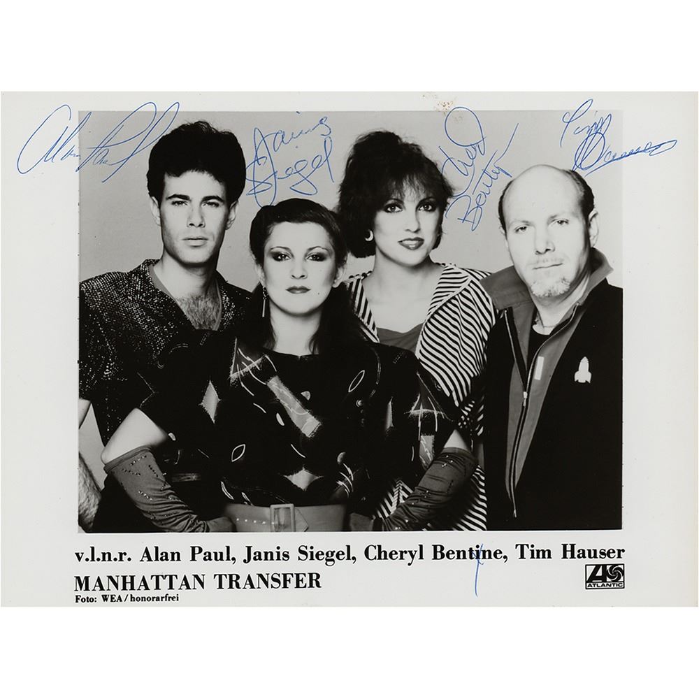 Glossy 9.25 x 7 photo of Manhattan Transfer, signed in blue ballpoint by Alan Paul, Janis Siegel, Cheryl Bentine, and Tim Hauser. In fine condition.