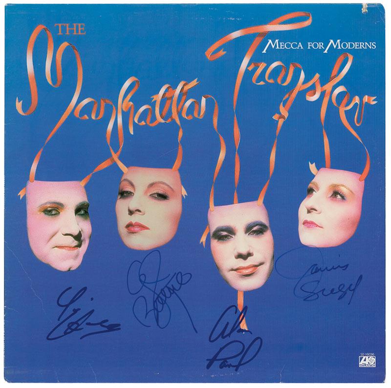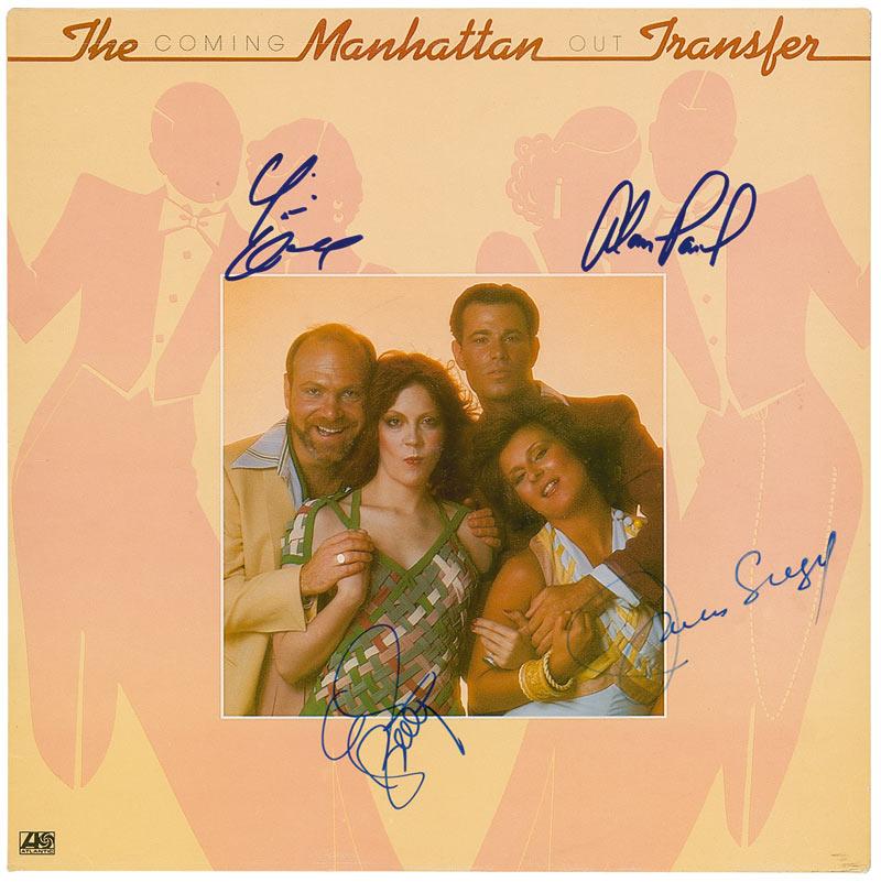Two albums, Mecca for Moderns and Coming Out, both signed on the front in blue felt tip by all four members: Cheryl Bentyne, Tim Hauser, Janis Siegel, and Alan Paul. In overall fine condition, with scattered creasing, light wear and a trivial remainder cut to the top right corner of Mecca for Moderns. The records are not included.