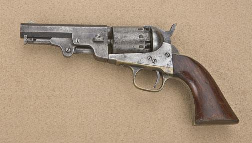Manhattan percussion pocket revolver, .36 cal., 4” octagon barrel, blue and case hardened finish, wood grips, #39175. This gun is in overall very good condition showing traces of blue in protected areas on barrel,case hardening has gone to a silvery finish, considerable cylinder scene remaining, scattered scratches and mars on barrel assembly and right rear recoil cut out, good action, dark bore, approx. 20% originalsilver plating on trigger guard, overall good grips with some scattered mars and wear from carry and storage. Est.: $400-$800.