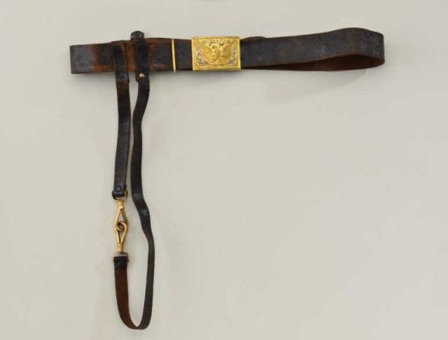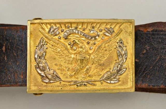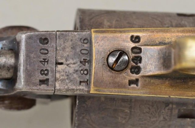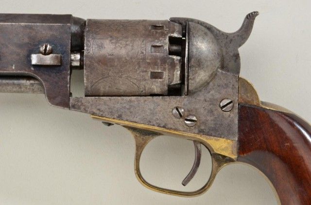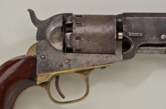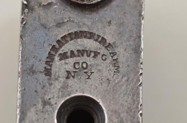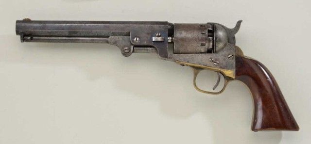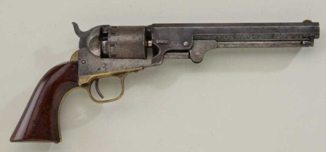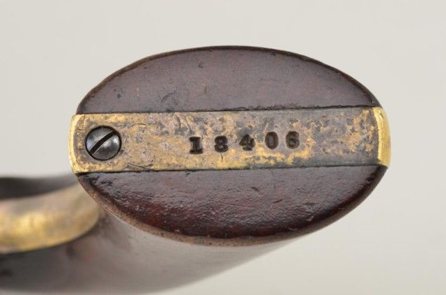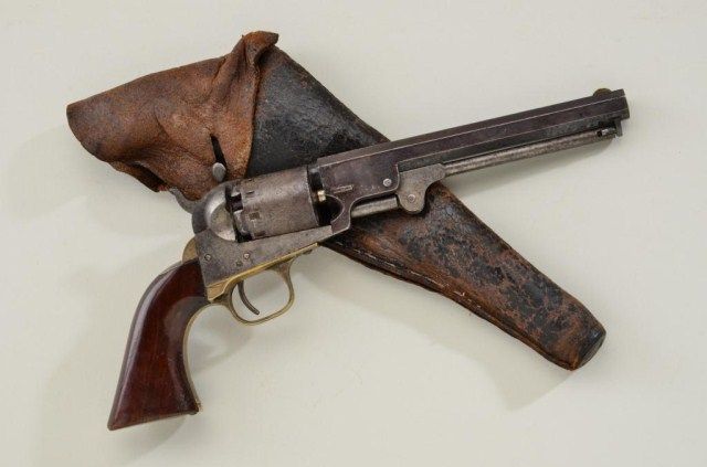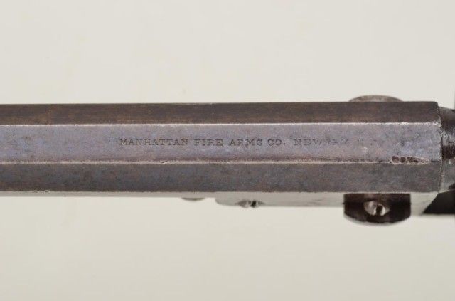 Manhattan percussion revolver, .36 cal., 6-1/2” octagon barrel, blue and case hardened finish, wood grips, #18406 accompanied by a leather flap holster, iron Manhattan marked bullet mold and leather belt with U.S. brassspread eagle and Union shield officer’s buckle. The gun is in overall good to very good condition showing traces of original blue in protected areas of the barrel, scattered traces of original case color onthe frame and loading lever, majority of original cylinder scene remains; all matching visible numbers, fair bore, crisp action, strong markings, very good wood grips with considerable original varnish. The mold is in overall good condition with some old mars and pin prick pitting; the holster is fair showing checkering of the top layer of leather on the body of the holster and well-worn flap; the accompanying belt is fair + with attached hanger; the buckle is very good; no other information on this grouping is available except consignor tag indicating “From Dick Malone, Jan. 1989; it’s a fairly safe bet that this set likely saw action in