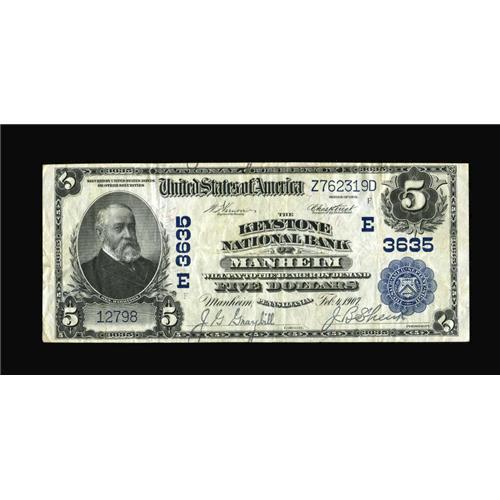 <B>Manheim, PA</B></I> - $5 1902 Plain Back Fr. 600 <B>The Keystone NB</B></I> Ch. # (E)3635<BR>While Series 1929 examples abound from here, large notes from this Lancaster County issuer are scarce indeed, with the census standing at under ten pieces of all kinds. This attractive note is as nice as any we recall seeing from here. <B>Very Fine,</B></I> with clear signatures.<BR><BR><b>Shipping:</b> Coins & Currency (<a target="_blank" href="http://www.heritageauctions.com/common/shipping.php">view shipping information</a>)