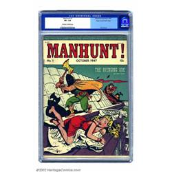 Manhunt #1 Mile High pedigree (Magazine Enterprises, 1947) CGC VF+ 8.5 Off-white to white pages. Ogden Whitney, who would later give us dozens of covers and stories for the ACG titles, provides an eye-catching babe-in-danger cover in this premiere issue, which also features work by the masterful L. B. Cole. When was the last time you saw this book at all, much less in high-grade? That's what we're talking about! Overstreet 2002 VF 8.0 value = $286. Important notice: We expect to be auctioning lots at the rate of 200-250 per hour. Sometimes eBay Premier live bid software cannot keep up with that pace, so we strongly recommend that you place a realistic proxy bid now as insurance to avoid disappointment. Also please note that all Heritage/CAA lots purchased through eBay Premier carry a 20% Buyer's Premium. Please make sure you read the Terms and Conditions.