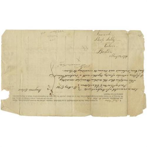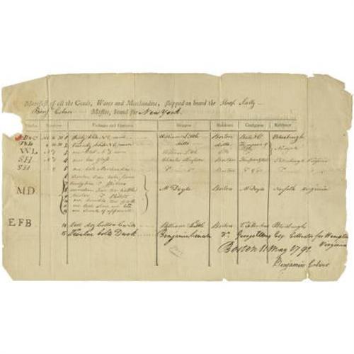 <B>Manifest of Goods Shipped Aboard the Sloop <I>Sally</B></I></B></I><B>, Bound for New York, May 23, 1791,</B></I> 13 x 8, two pages (front and verso). Signed by the ship's master Benjamin Colver. Included in the shipment are <I>Twelve bolts of Duck</B></I> to Benjamin Lincoln (1733-1810), a major general in the Continental Army during the American Revolutionary War. Edges ragged, else fine. <B></B></I><BR><BR><b>Shipping:</b> Flat Material, Small (<a target="_blank" href="http://www.heritageauctions.com/common/shipping.php">view shipping information</a>)
