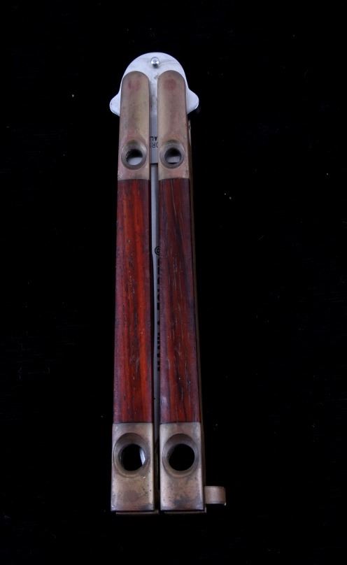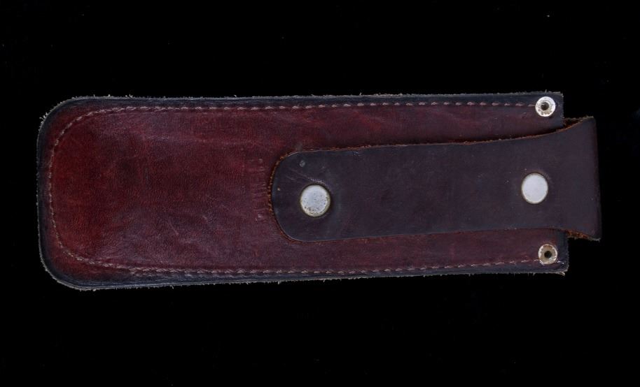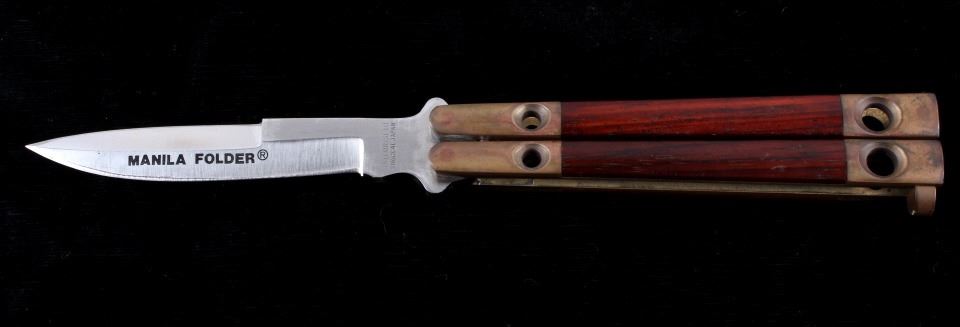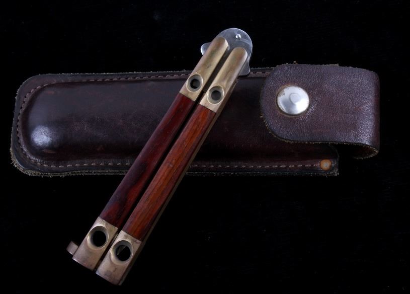 Featured in this lot we have a Manila Folder butterfly knife with leather case. The knife shows a stainless steel blade with a spear point blade, Brass handle with wood accents. The blade is marked "Manila Folder ® - Taylor/ Seto Surgical Japan - G-972" across the length of the blade and near the blade base. The sheath is constructed out of a dark stained leather with a steel clasp. The knife and sheath are both in good condition overall with a nice warm patina on the brass. The blade measures 4" long and 9" overall.