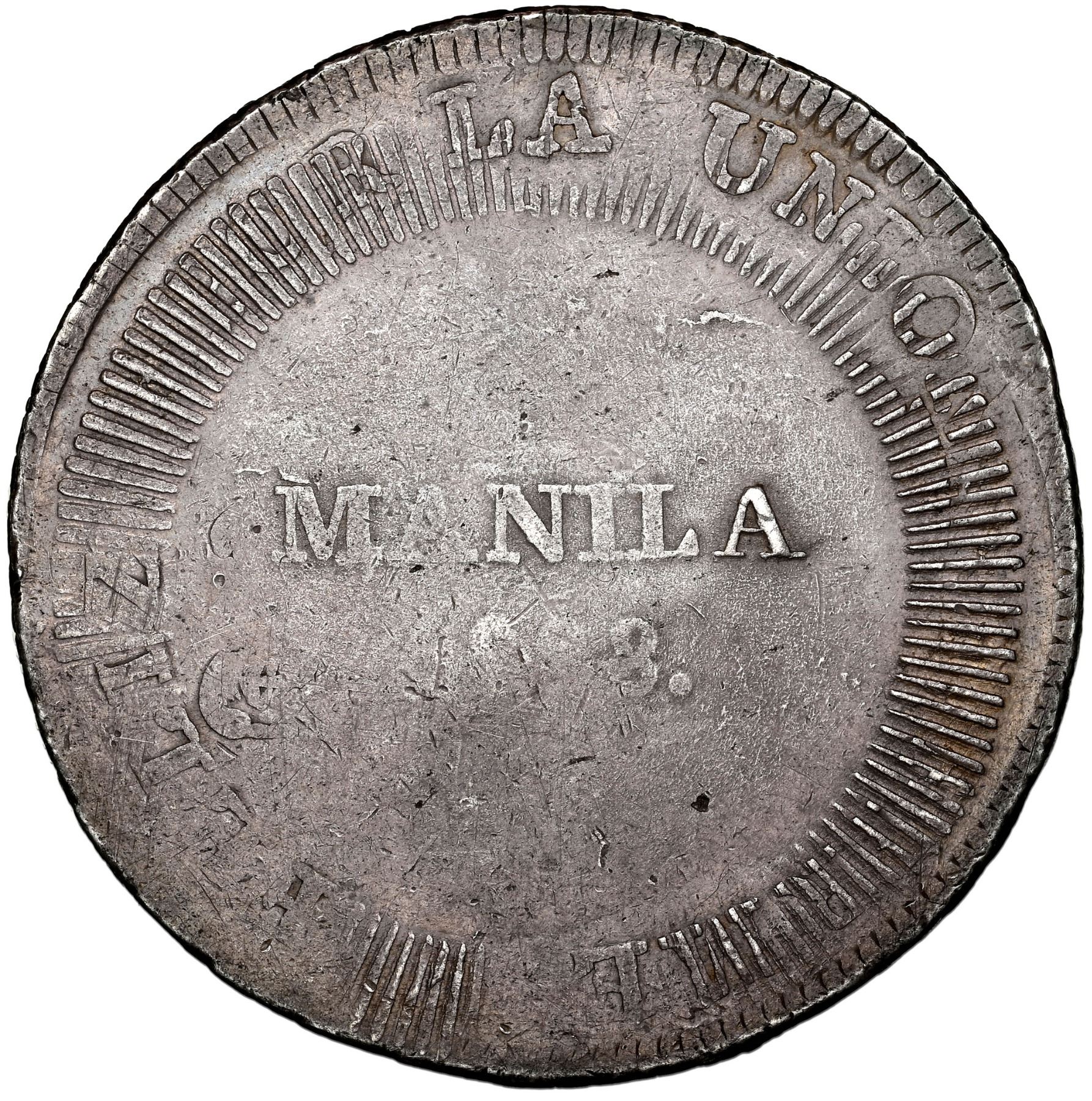 Manila, Philippines (under Spain), 8 reales, 1828 countermark (Type I) on a Lima, Peru, 8 reales, 1826 JM, very rare. KM-33; Cal-1303. Typically weakly struck XF, one side with MANILA above date and lined border design only partially covering the host's legend (that side possibly lightly cleaned), the other side with bolder crowned arms and less border but with (parts of) legend HABILITADO POR EL REY N.S.D. FERN. VII., also with more host details visible, including mintmark, denomination, assayer and date, that side also darker in tone, rather nice overall for this highly sought first crown-sized issue of the Philippines. It is worth noting that it was the lack of minting pressure and subsequent failure of the border design to efface the peripheral host details that this Type I striking was discontinued early on, which is why it is so rare. With NGC tag XF details / cleaned.