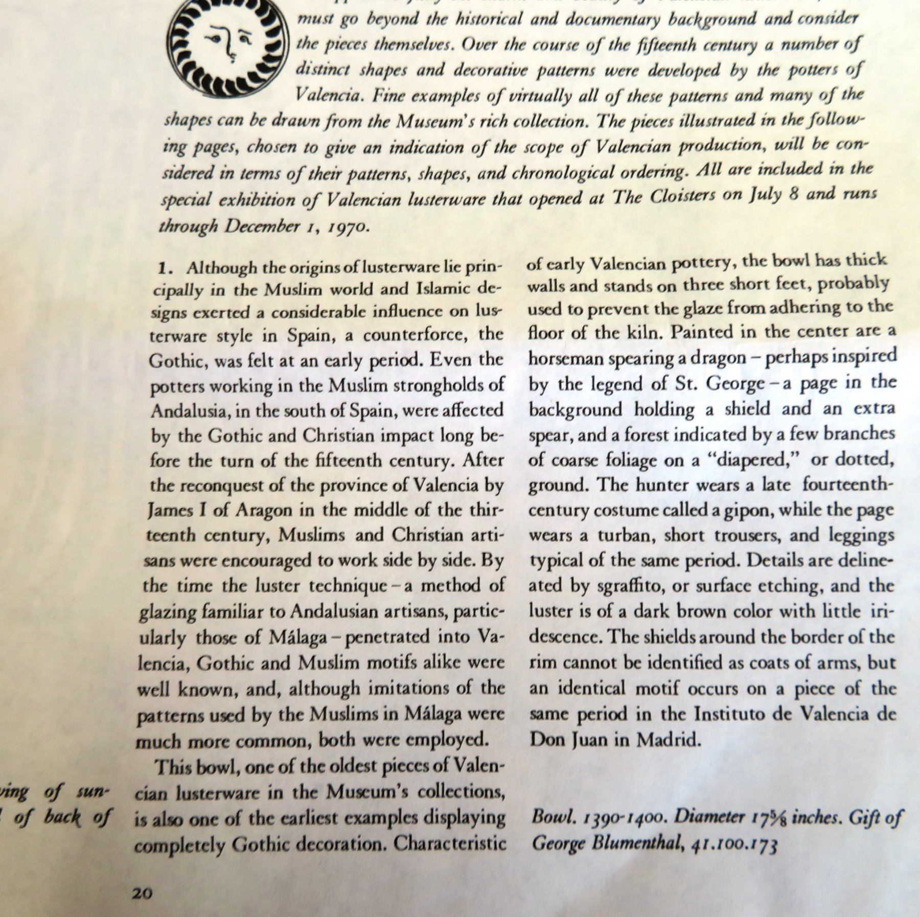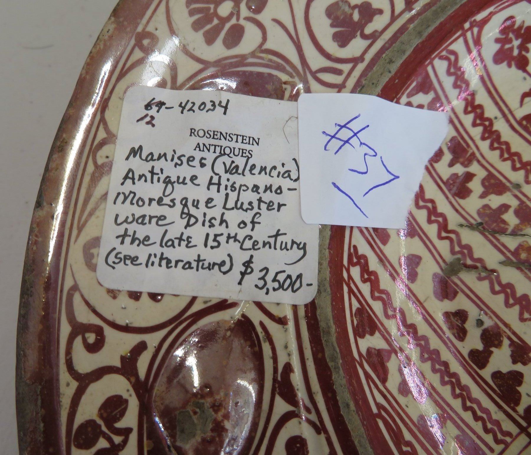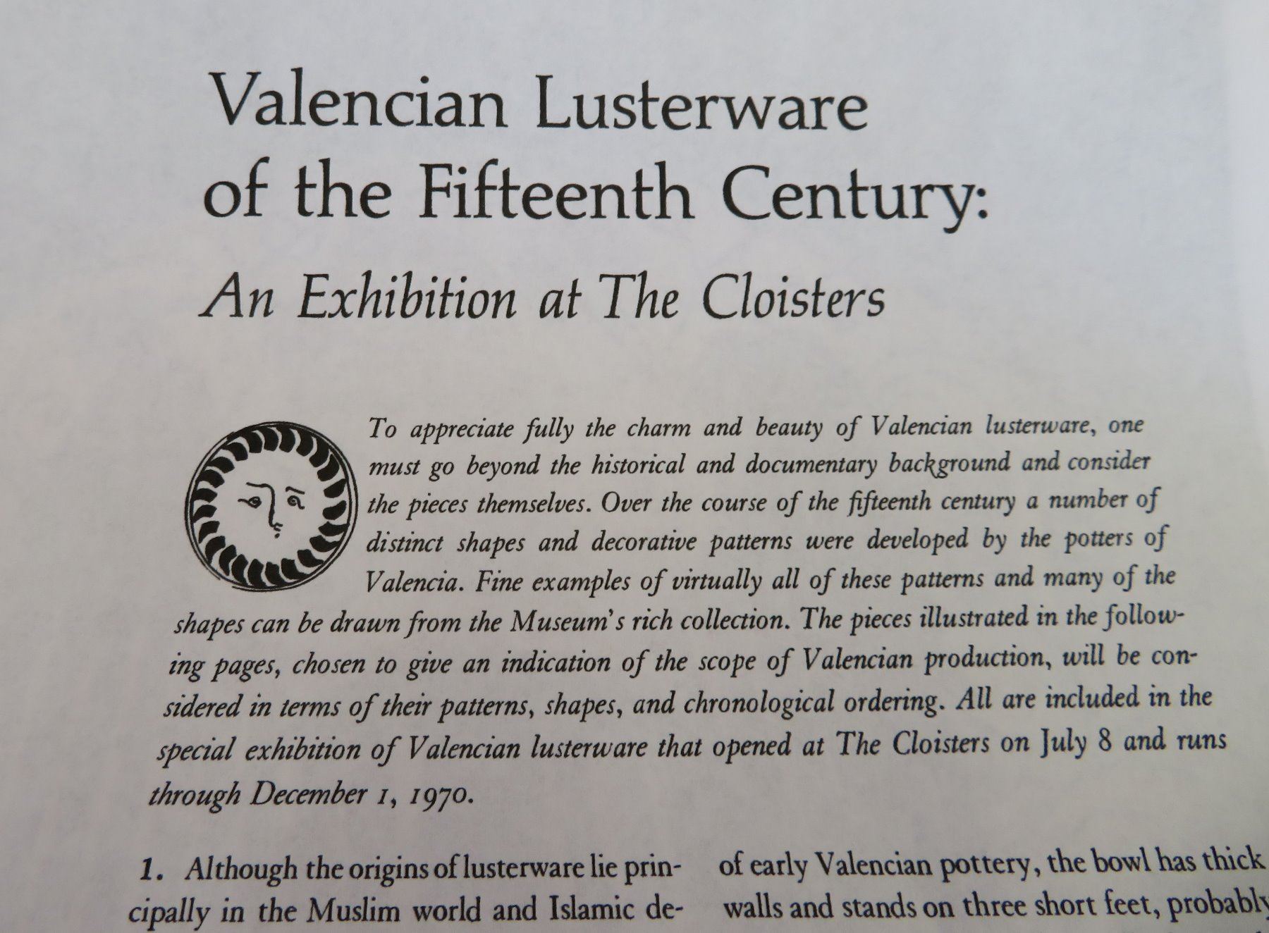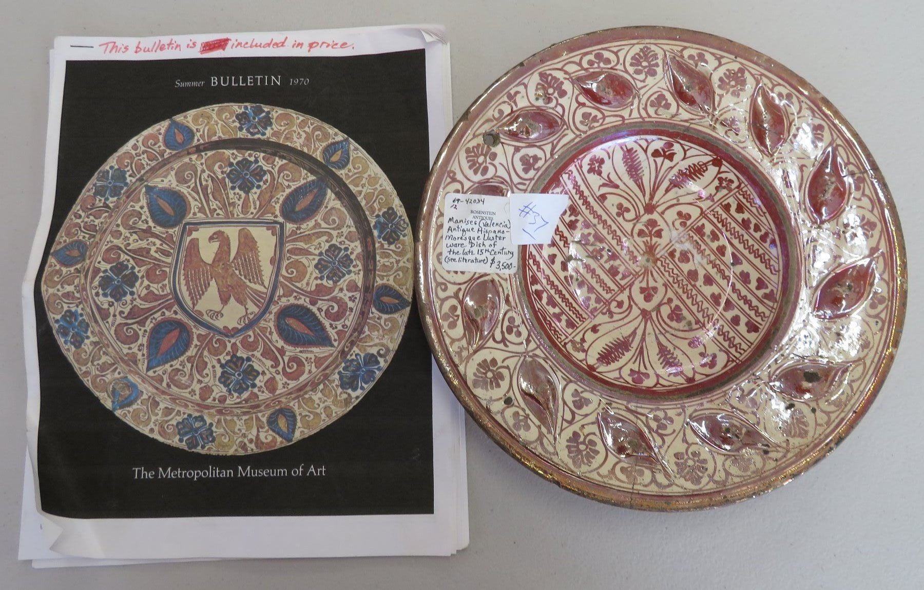Manises Valencia Dish, c. 15th century item. Made of ceramic, the item measures 9 1/4" x 1 1/4". Valencia, Spain. See images of 1970 Met Museum of Art documents. Condition: Has been cracked and repaired, see images. Shipping: $55.00 USA estimate only, double-boxed, due to value.