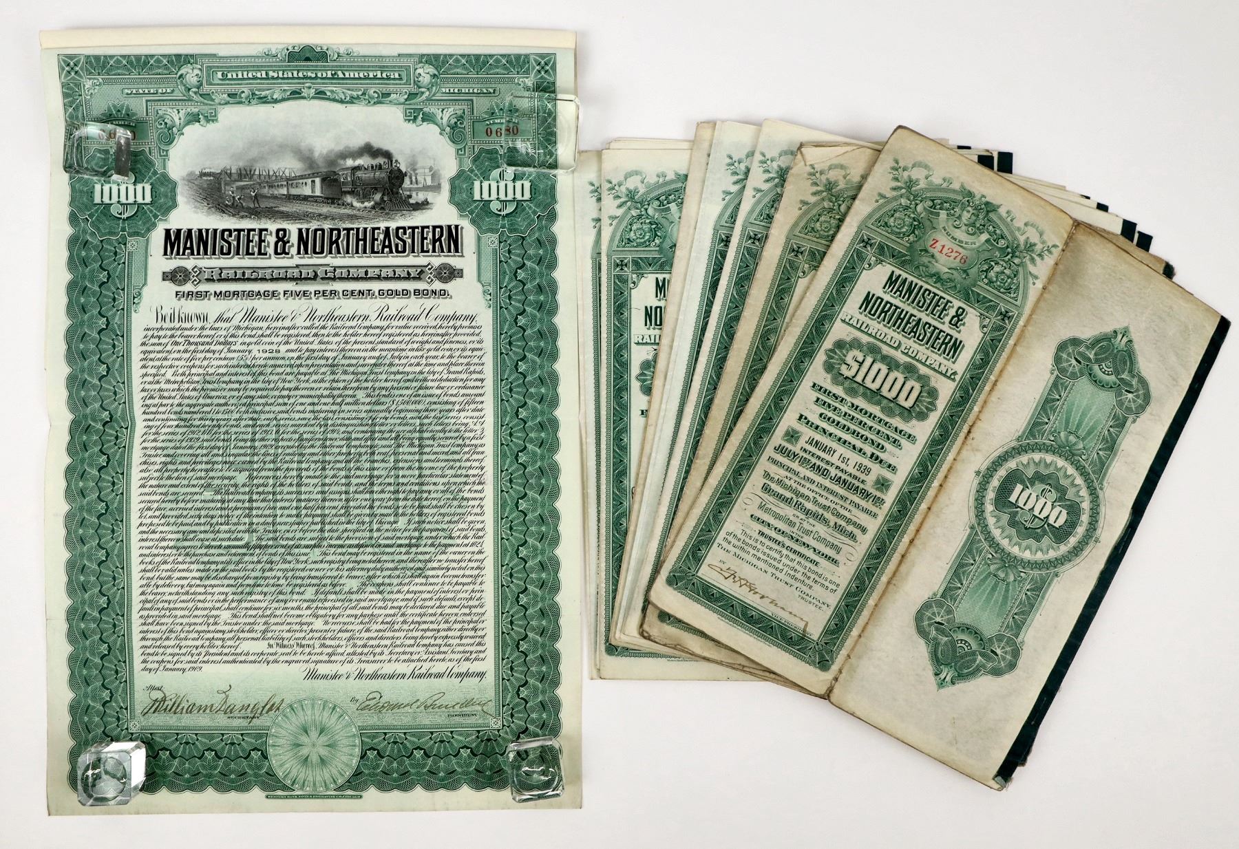 Lot of 11. I/C. Issued 1919. VG or better. Manistee & Northeastern Railroad Co., $1000, 5% gold bearer bonds, with coupons. Western BNC printer.