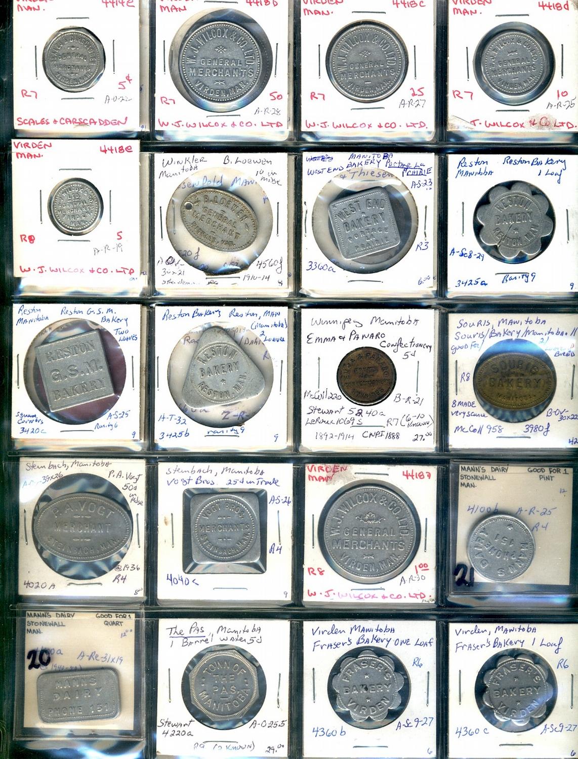 Manitoba. Various dairy and merchant tokens from the following locals: Reston, Rosenfeld, Selkirk, S