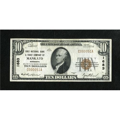 <B>Mankato, MN</B></I> - $10 1929 Ty. 1 <B>The First NB & TC</B></I> Ch. # 1683<BR>Only eight small are reported on this second title note from Blue Earth County. Pleasing <B>Very Fine-Extremely Fine</B></I> with pleasing surfaces and plenty of color.<BR><BR><b>Shipping:</b> Coins & Currency (<a target="_blank" href="http://www.heritageauctions.com/common/shipping.php">view shipping information</a>)