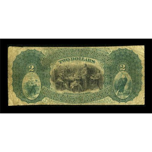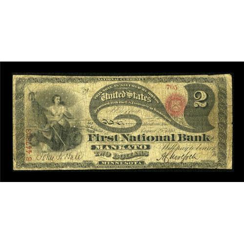 <B>Mankato, MN</B></I> - $2 Original Fr. 388 <B>The First NB</B></I> Ch. # 1683<BR> This piece will receive a lot of attention from both Minnesota collectors and collectors assembling sets of Nationals by Friedberg number. Census information indicates only three other Jeffries-Spinner Lazy Deuces are known, one from the Greene County NB of Springfield, Missouri, and two from the First National in Hillsborough, New Hampshire. The last piece to appear at auction was the Missouri issue and that was nearly two decades ago. In Large Size Type, notes with four known survivors almost assuredly sell for six figures or more. This note is whole and attractive for the grade, save for some minor pinholes. <B>Very Good.</B></I><BR><BR><b>Shipping:</b> Coins & Currency (<a target="_blank" href="http://www.heritageauctions.com/common/shipping.php">view shipping information</a>)