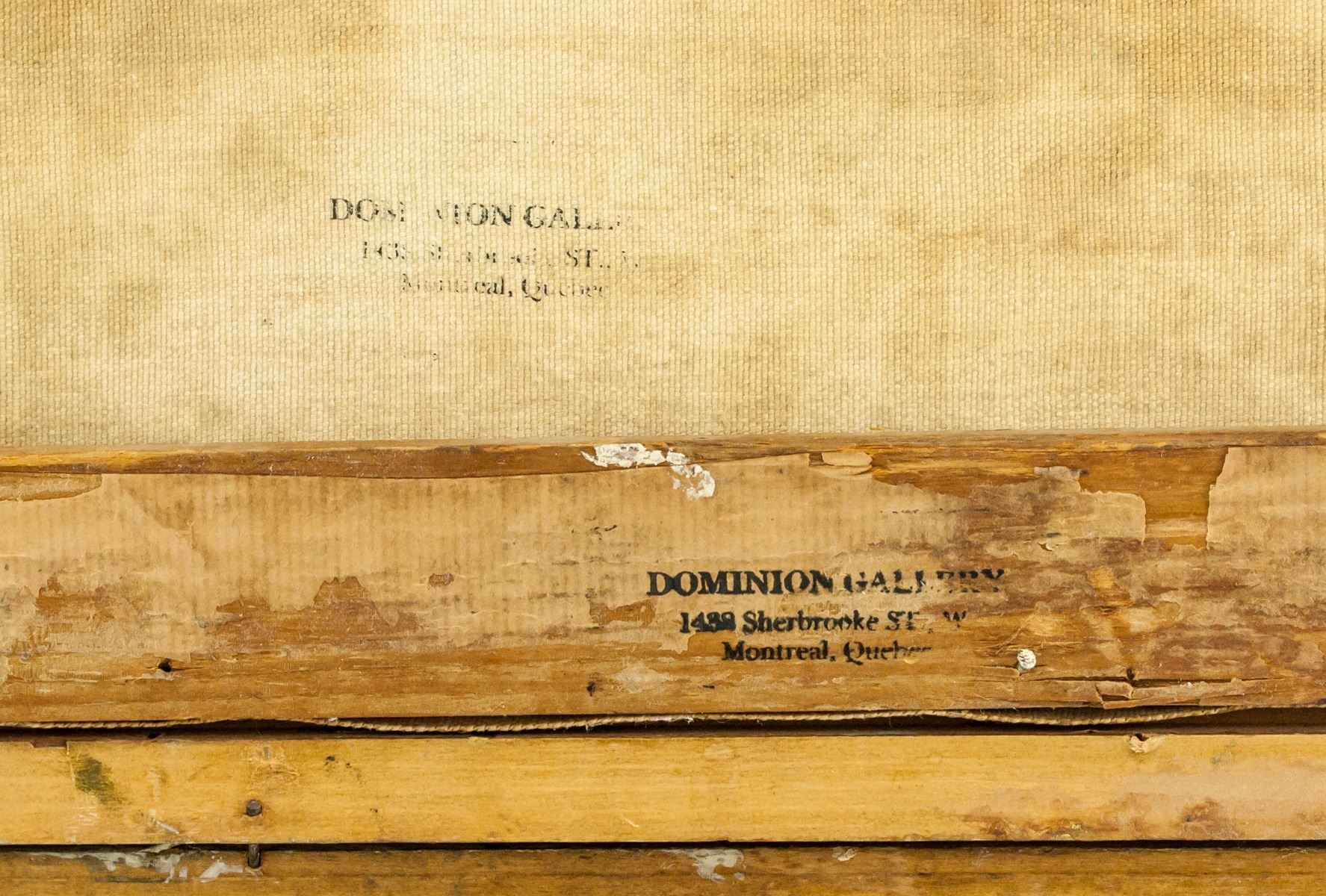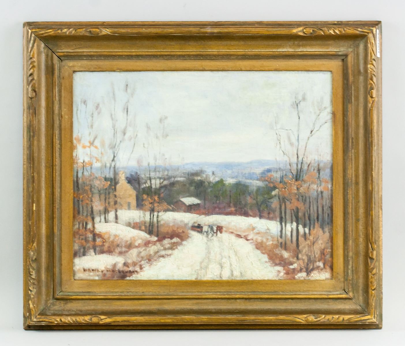 Oil on canvas, framed. Featuring snowy scene with a horse drawn sleigh approaching from a distance. Signed "Manly Macdonald" in the bottom left corner. Two stamps on verso read "DOMINION GALLERY 1438 Sherbrooke St., W. Montreal, Quebec". "MANLY MACDONALD "HOARSE[sic] & SLEIGH NEAR QUINTES BAY"" inscribed on verso. "89-A" inscribed on verso twice. Attributed to Manly Macdonald (1889-1971, Canadian). 73 x 34.3 cm (17 x 13.5 in). PROVENANCE: This lot carries limited provenance from a Private Toronto collection