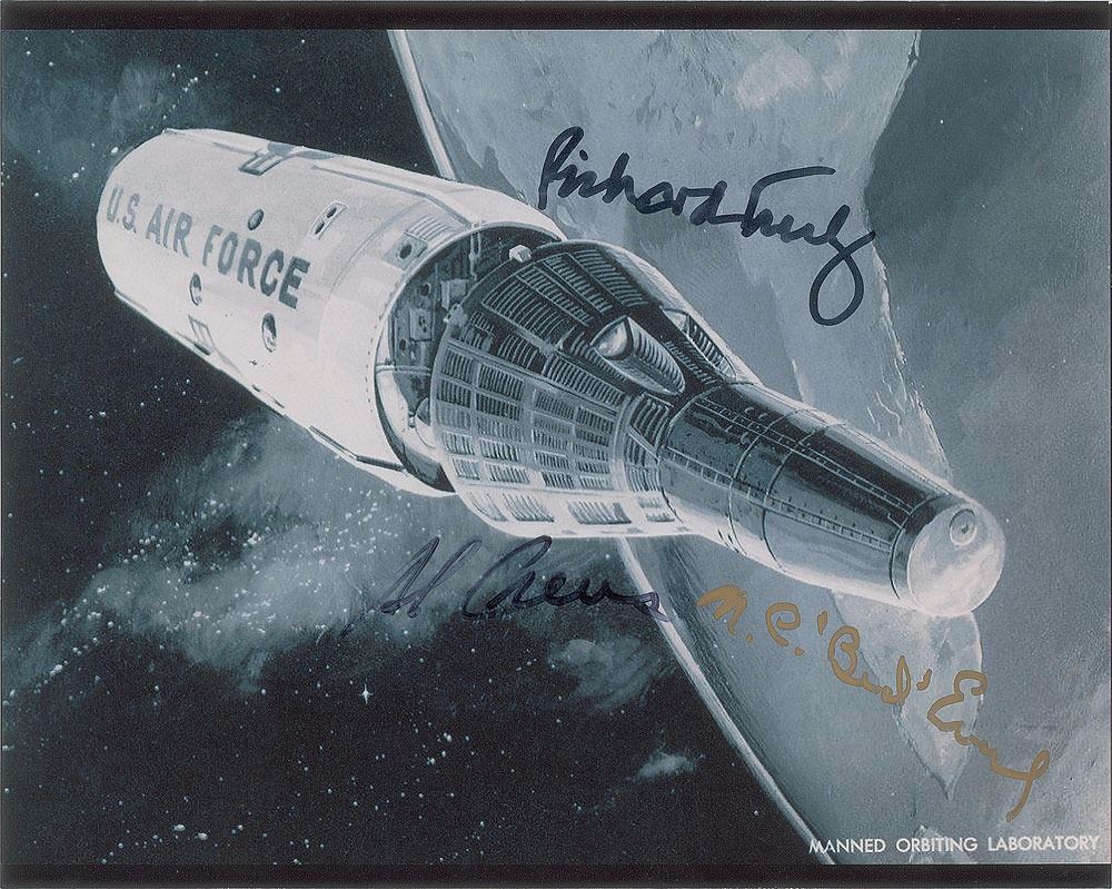 Satin-finish 10 x 8 photo of an artistic depiction of the Manned Orbiting Labor, signed in black felt tip by Richard Truly and Al Crews, and in gold ink by Bud Evans. In fine condition, with some graininess to image and contrast to one signature. Part of the United States Air Force's manned space flight program, the MOL was developed from early concepts of manned space stations to be used for NASA survey purposes, but was ultimately canceled during the height of the Apollo program in 1969, when more cost-effective unmanned reconnaissance satellites were found to achieve similar results. NASA's space station program went ahead full-blast in the mid-1970s with the advent of Skylab. This photo originates from the Astronaut Scholarship Foundation, a portion of the proceeds for the sale of this item will be donated to the ASF.