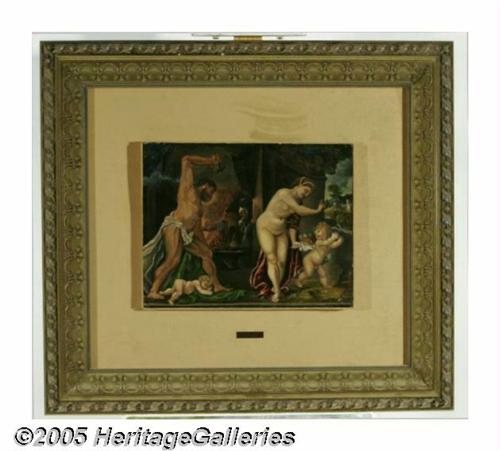 <B>Manner of ADRIEN van der WERFF (Dutch 1659- 1722)</B></I><BR>Venus and Vulcan<BR>Oil on panel<BR>14in. x 18.25in.<BR><BR>Condition Report: Board is warped, overpaint along top and left edges, substantial overpaint in torsos of Vulcan and Venus, light inpaint in cupid on right, overpaint on leg of sleeping child<BR>