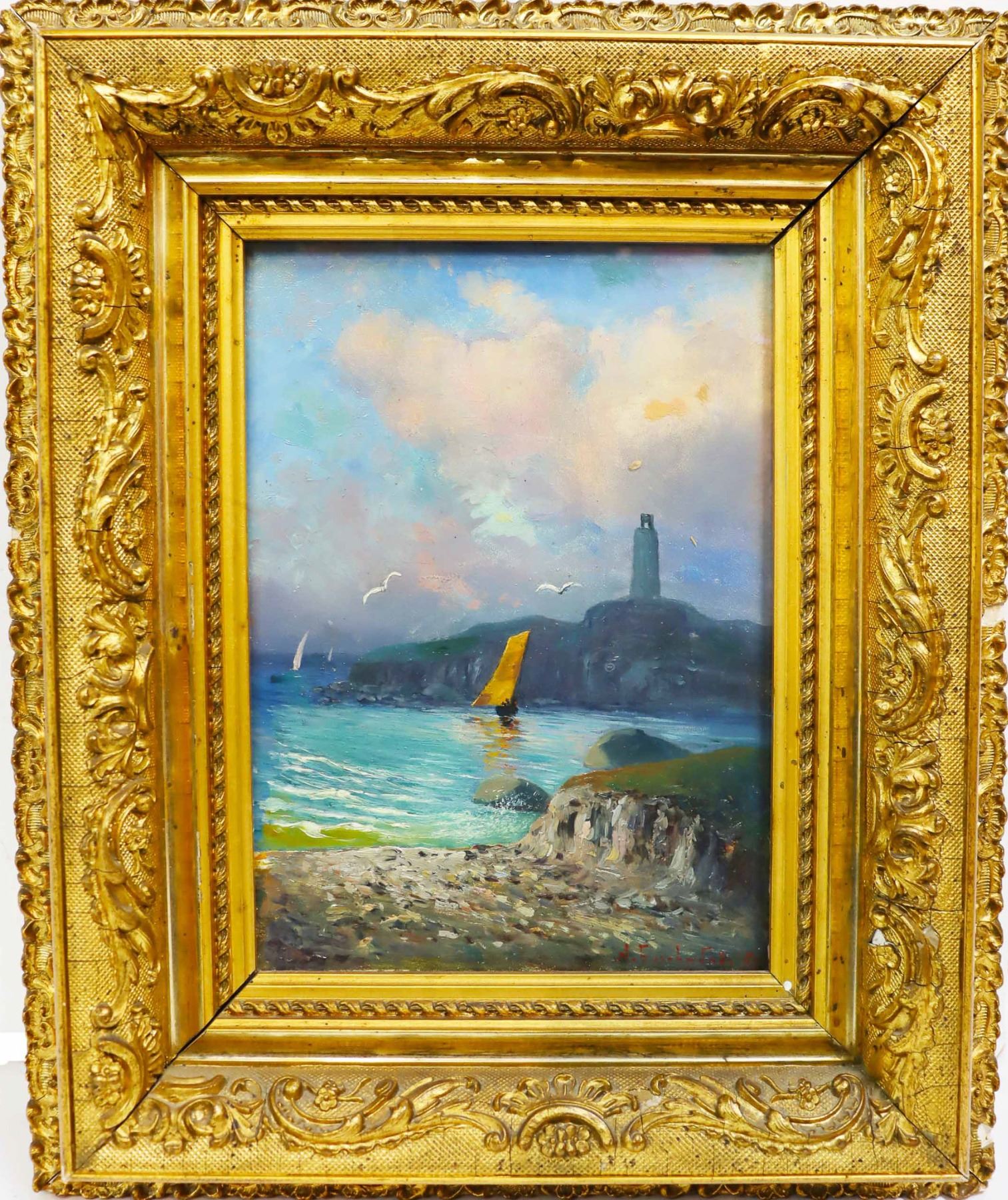 Beautiful luminous painting of a sailboat near the shore with lighthouse in the background, a glorious cloud-filled sky above. Oil on board, signed lower right indistinctly. Framed under glass.