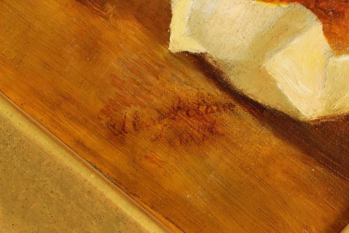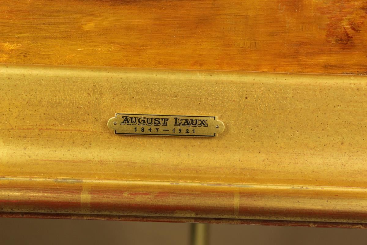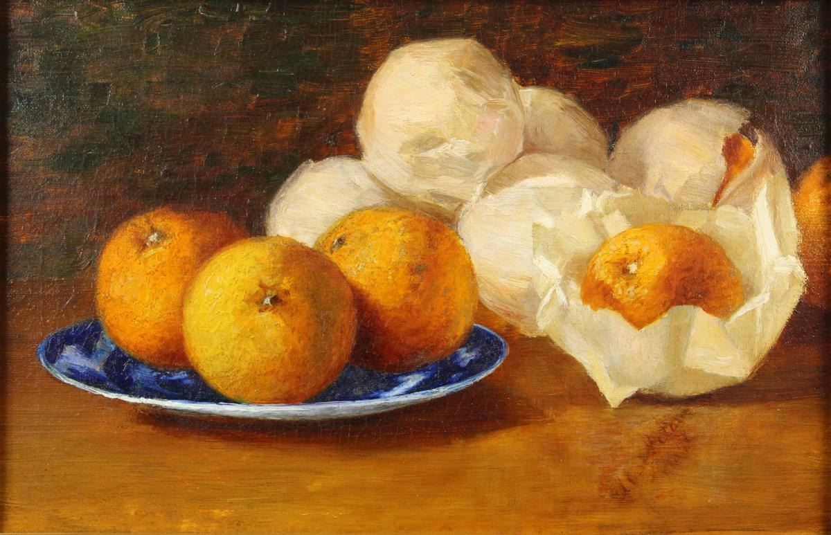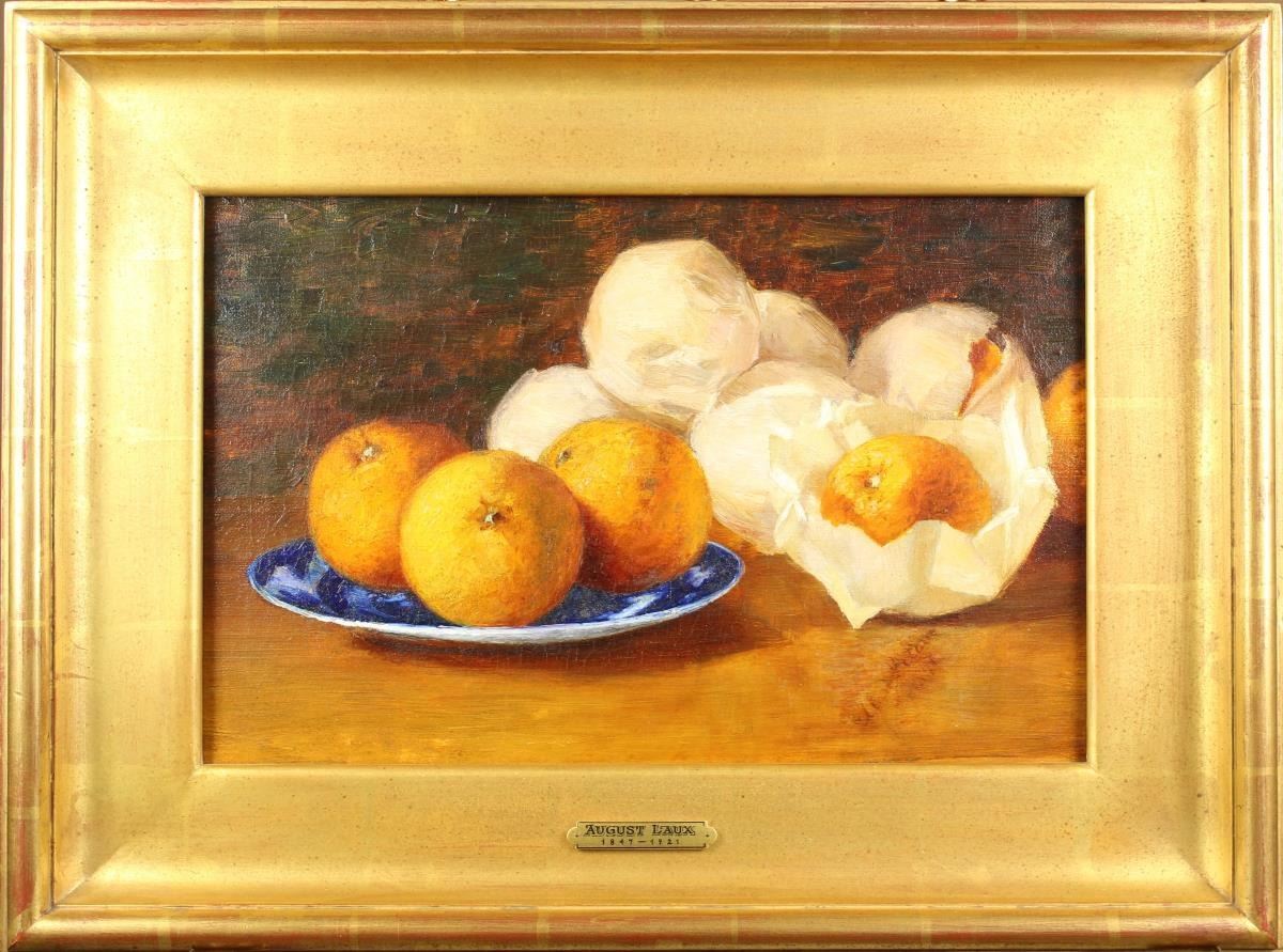 Exquisite rendering of a still life with oranges, oil on canvas. Provenance: Acquired at Richard Bourne. Born in the Rhineland area of Germany, August Laux became noted for his richly colored, precisely rendered floral still lifes and genre scenes, although early in his career his reputation was for frescoes and decorative painting. After 1880, he turned to still life and genre painting, which he continued until his death in Brooklyn in 1921.