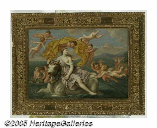 <B>Manner of FRANCOIS BOUCHER (French 18th Century)</B></I><BR>The Abduction of Europa<BR>Oil on canvas<BR>15.5in. x 22in.<BR>Inscribed on stretcher: Casa Sangiorgi, Via Carissimi 30, Roma<BR><BR>Condition Report: Unlined original canvas, .5in. tear lower center near knee of Europa (mended), 3mm. dia. loss area under cherub upper left, 1mm. dia loss left of cherub riding dolphin, frame abrasion around edges, fine inpainting in figure of Europa and cherubs right of bull, scattered overpaint in sky, craquelure throughout.<BR><BR>David Dike: Agree with description, condition and value estimate.<BR>Brian Roughton: No comment. Condition as noted.<BR>