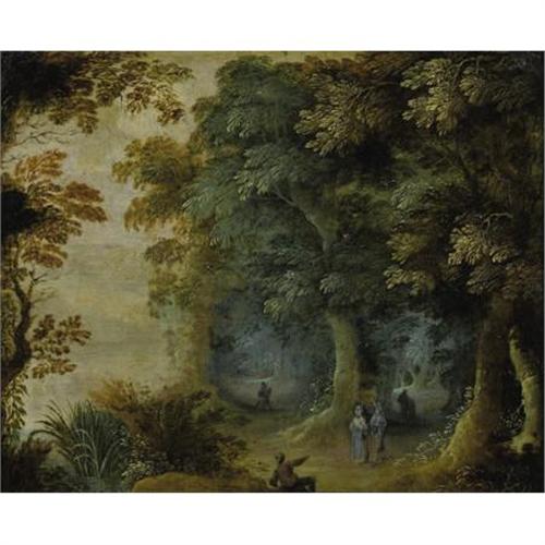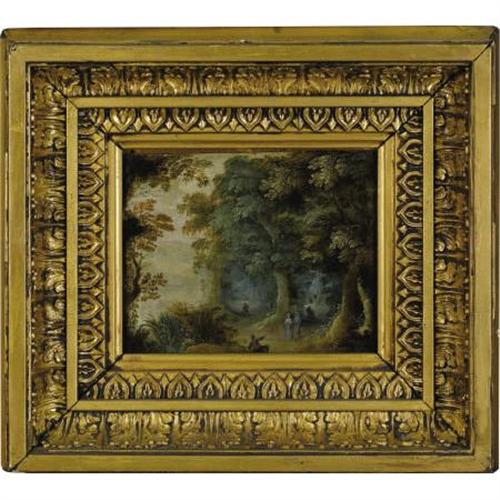 <B>Manner of GILLIS VAN CONINXLOO I </B></I>(Dutch 1544-1607)<BR><I>Wooded Landscape with Hunter and Figures Strolling</B></I><BR>Oil on copper <BR>6 x 7 inches (15.2 x 17.8 cm)<BR><BR> <B>Condition Report:</B> Framed, upper left corner is bent and possible repair.<BR><BR><b>Shipping:</b> Requires 3rd Party Shipping (<a target="_blank" href="http://www.heritageauctions.com/common/shipping.php">view shipping information</a>)