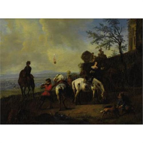 <B>Manner of NICOLAES BERCHEM </B></I>(Dutch 1620-1683)<BR><I>Italianate Landscape with Figures Preparing for a Hunt</B></I><BR>Oil on canvas<BR>10-1/2 x 13-1/2 inches (26.7 x 34.3 cm)<BR><BR> <B>Condition Report:</B> Canvas has been relined, thick, old varnish, 3/4 inch tear in center of canvas<BR><BR><b>Shipping:</b> Requires 3rd Party Shipping (<a target="_blank" href="http://www.heritageauctions.com/common/shipping.php">view shipping information</a>)