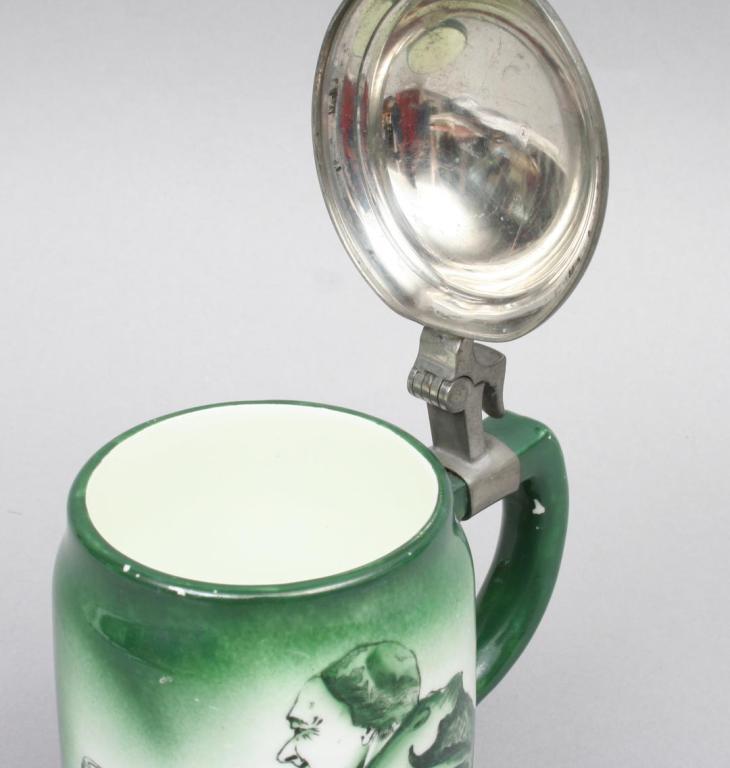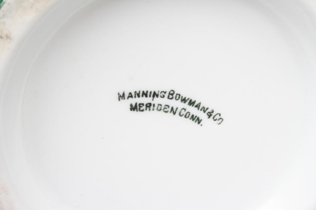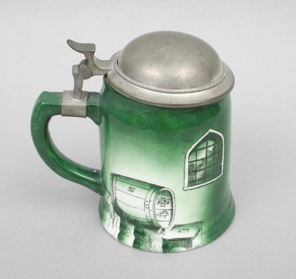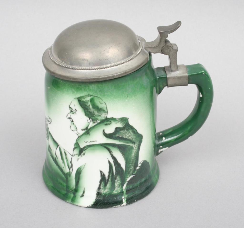 Retailed by Manning Bowman, painted in green enamel with a monk holding a tankard or stein, looking toward a keg, fitted with a white metal lid and thumb rest, stamped on the base Manning Bowman Co., Meriden Connecticut. 5 1/4"H. Condition: some light flaking to green enamel on handle, crimp to rim of stein, otherwise very good.
