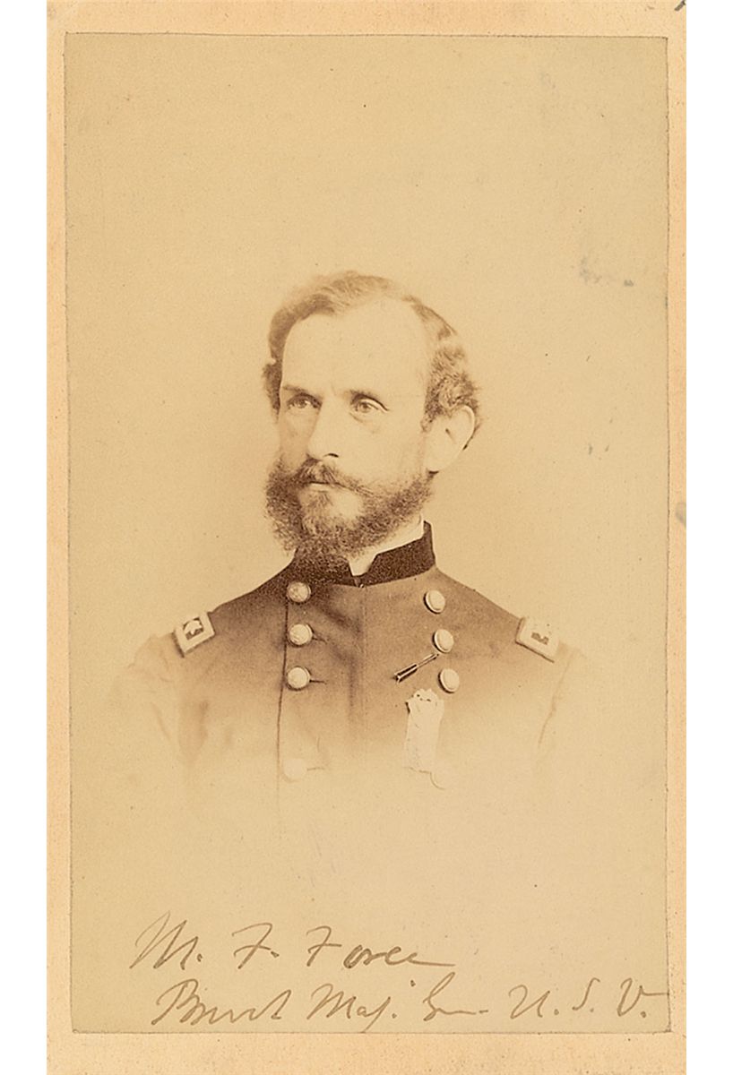 Union officer (1824–1899) who was awarded the Medal of Honor for his actions in the battle of Atlanta. Original 2.25 x 4 carte-de-visite photo, signed below the image in black ink, “M. F. Force, Brevt Maj. Gen U.S.V.” Some light creasing and wrinkling, otherwise fine condition.