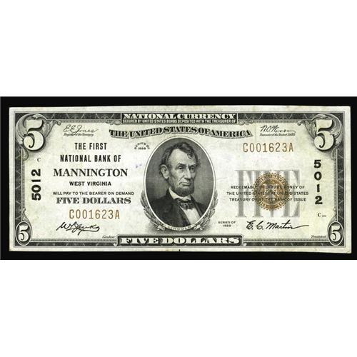 <B>Mannington, WV</B></I> - $5 1929 Ty. 1 <B>The First NB </B></I> Ch. # 5012<BR>A bright and well centered <B>Very Fine-Extremely Fine</B></I> note that is closer to the appearance of the higher than the lower grade. It is also from the only issuing bank located in this Marion County locale. This new addition to the census is the highest grade of four $5 Type 1 examples now documented from here and one of only seven known of the entire series from this issuer.