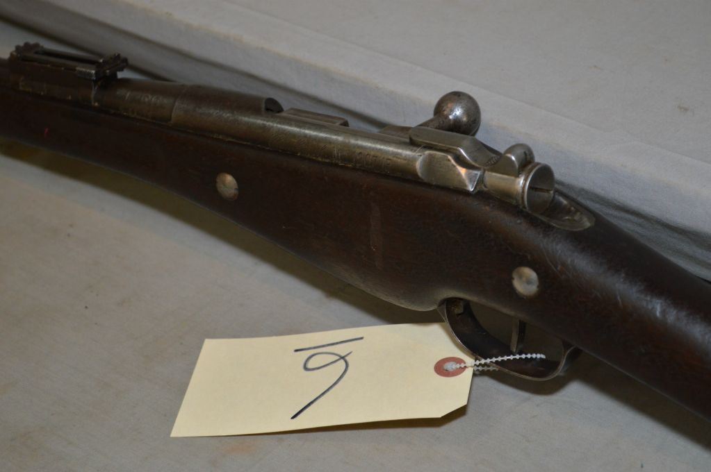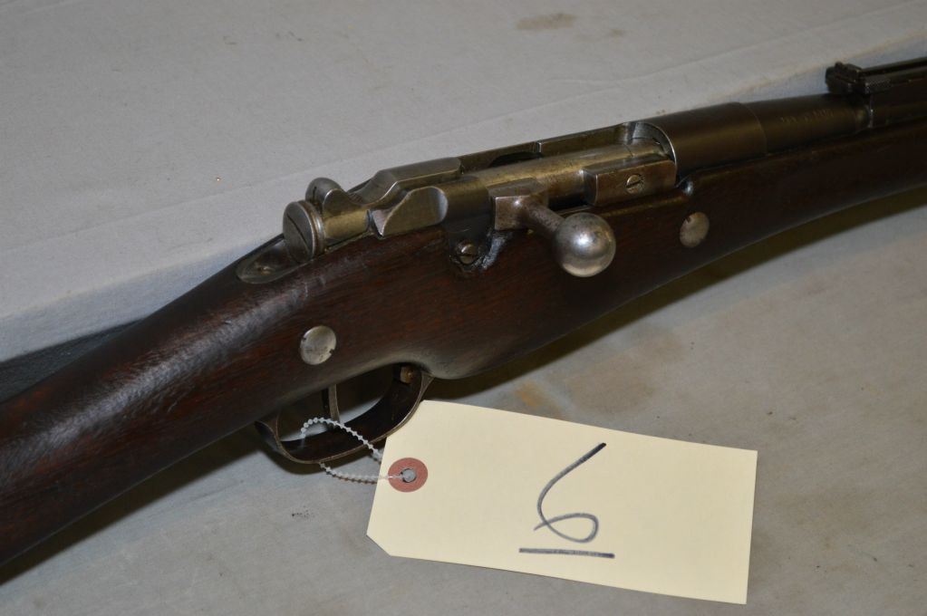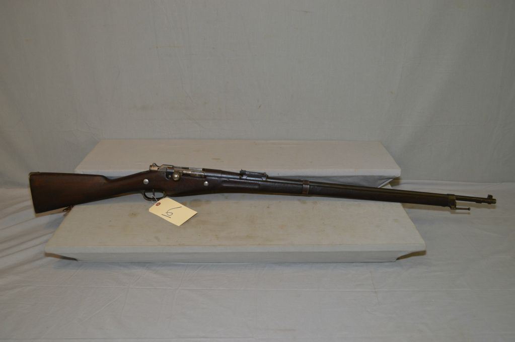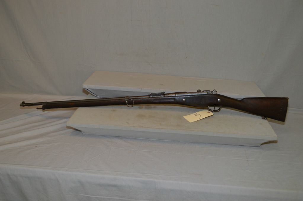 Mannlicher Berthier ( MAC MANF DE ARMS CHATELLERAULT ) Model 1907/15 .8 x 50 R Lebel Cal Full Wood Military Bolt Action Rifle w/ 31 1/2" bbl [ fading blue finish, barrel sights, barrel stamped MAC 1916, matching numbered wood, large ring on left side back barrel band, appears to be matching numbers ] Ser # 44053