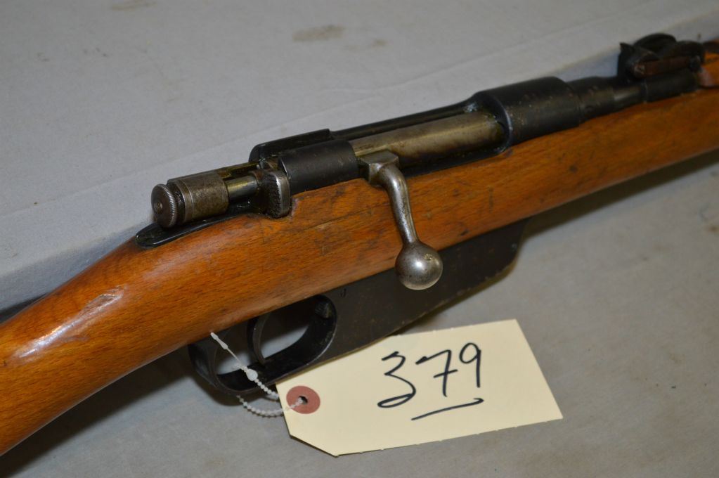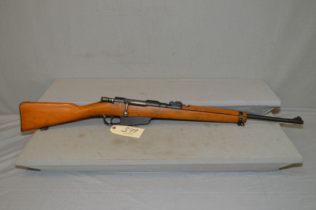 Mannlicher Carcano ( FAT 41) Model Sporter 6.5 x 52 Italian Cal Bolt Action Partly Sporterized Rifle w/ 22 1/2" bbl [ blued finish starting to fade, barrel sights, wood insert by bolt & safety, some top wood, w/sling swivels ] Ser # F2829