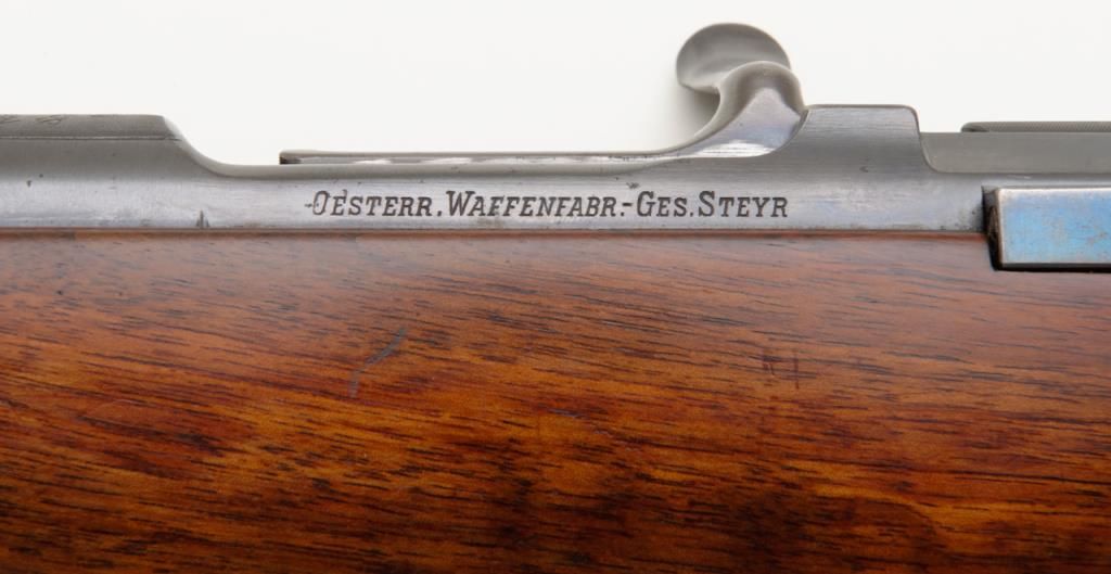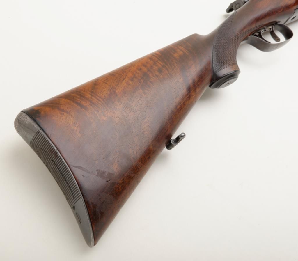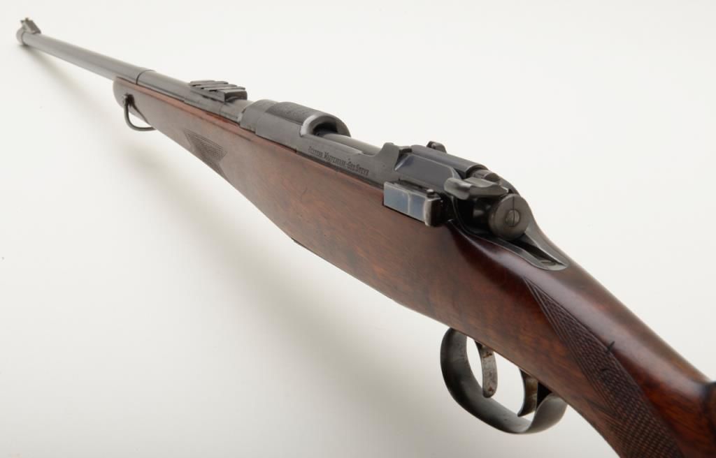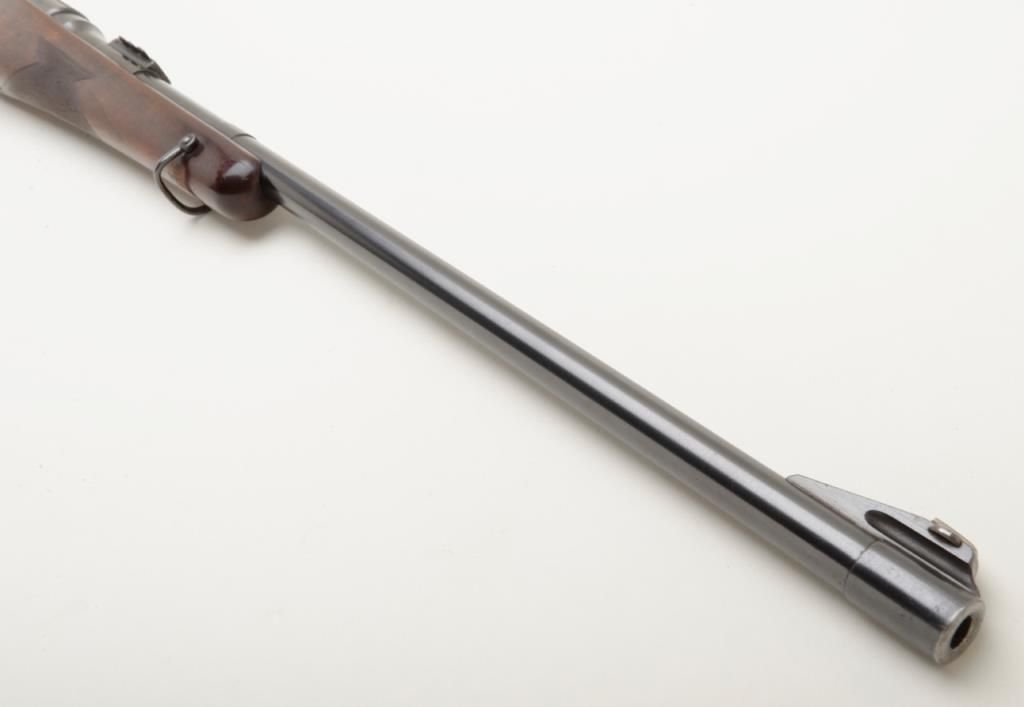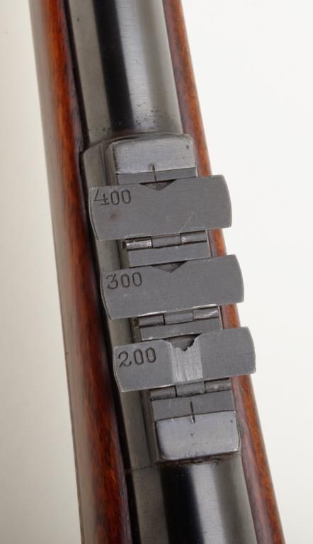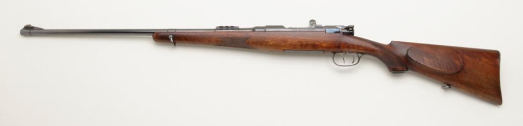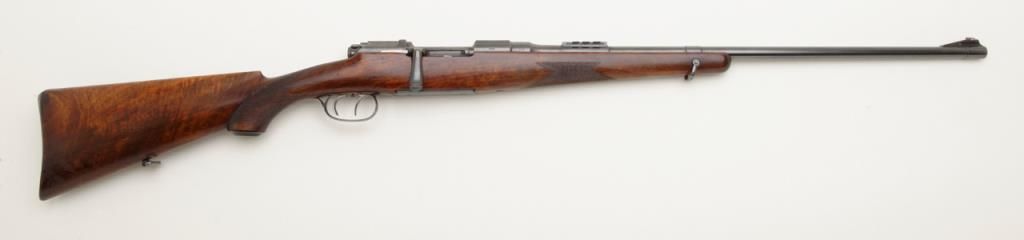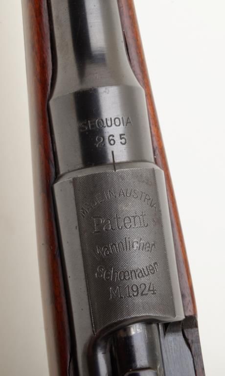 Mannlicher Schoenauer, Model 1924 rifle marked on the breech and the barrel marked “Sequoia 265” in very good plus to near fine condition, serial number 389. The rifle shows a 25” round barrel with 3 folding rear leaf sights graduated for 200, 300 and 400 yards. The rifle is half stocked in classic European manner showing double set triggers with a trap in the butt. The name Sequoia and 265 are professionally stamped and the blue matches the action nicely with approximately 95% remaining. The wood stocks are also very good plus to near fine showing some slight professional cleaning with no evidence of sanding. The trigger guard shows 50% to 70% blue and there is case hardening on the trigger plate which remains about 90%. The action is good, the bore is very good plus and will clean to near excellent. An interesting Mannlicher rifle in a very unusual caliber. Est.: $900-$1800