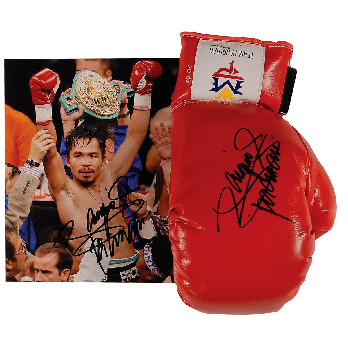 Red 20-ounce Team Pacquiao right-handed boxing glove, signed on the top in black felt tip; and a color satin-finish 8 x 10 photo of Pacquiao celebrating a victory, signed in black felt tip. In fine condition. Accompanied by a photo taken at time of signing the glove.