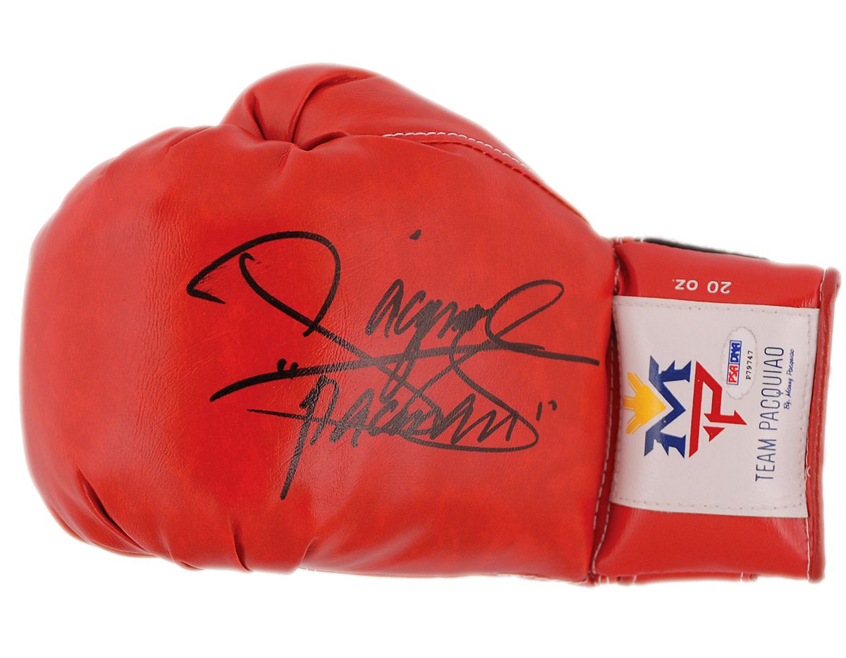 Red Team Pacquiao left-handed 20-ounce boxing glove signed in black felt tip on the top. In fine condition, with a PSA/DNA label affixed to the wrist.