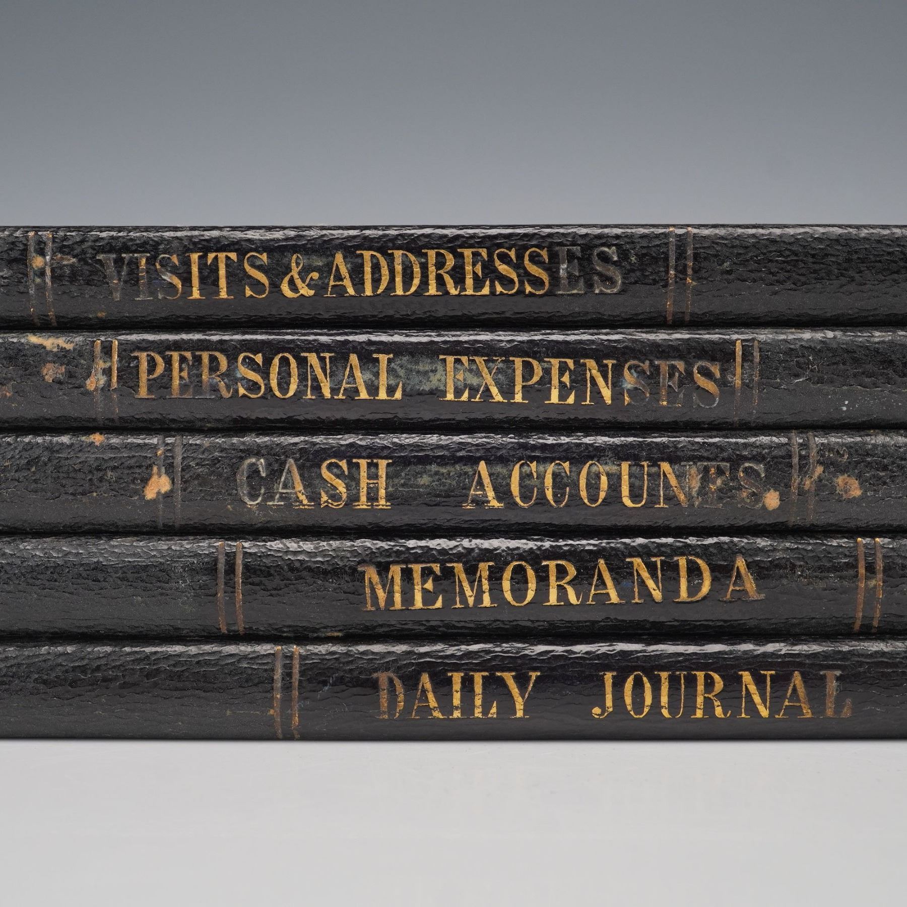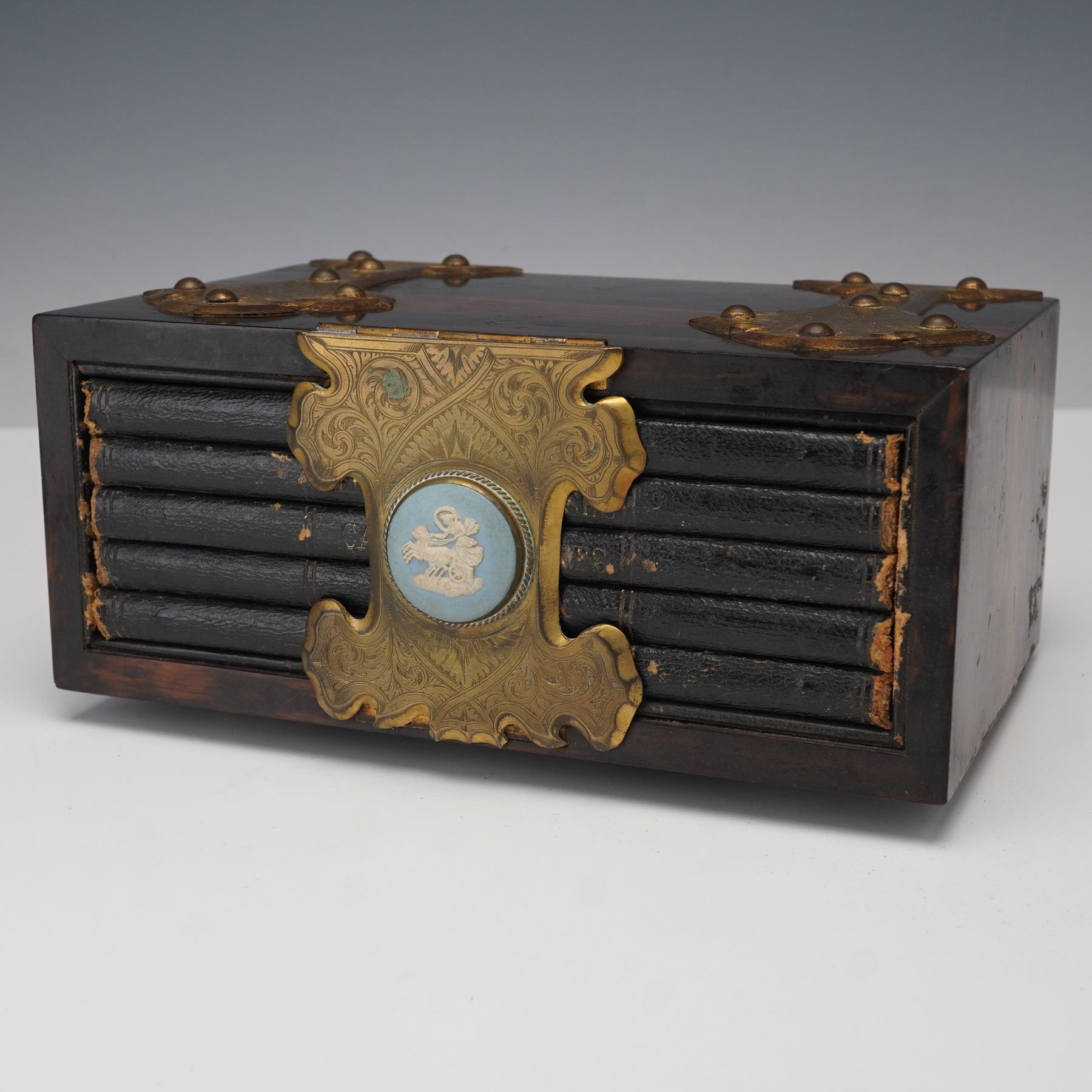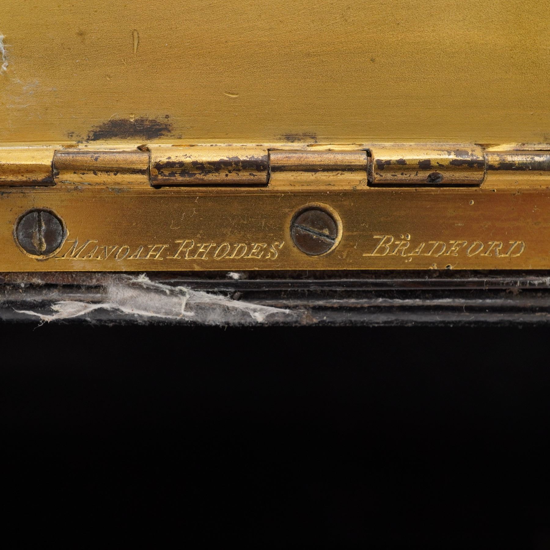 Inset with Wedgwood-style jasper plaques and enclosing five original ledgers titled "Daily Journal," "Memoranda," "Cash Accounts," "Visits & Addresses," and "Personal Expenses." The hinged interior is signed "Manoah Rhodes, Bradford" and features a presentation inscription reading "From your loving wife on the completion of your 20th year in business April 1st, 1878." The piece retains its original key.