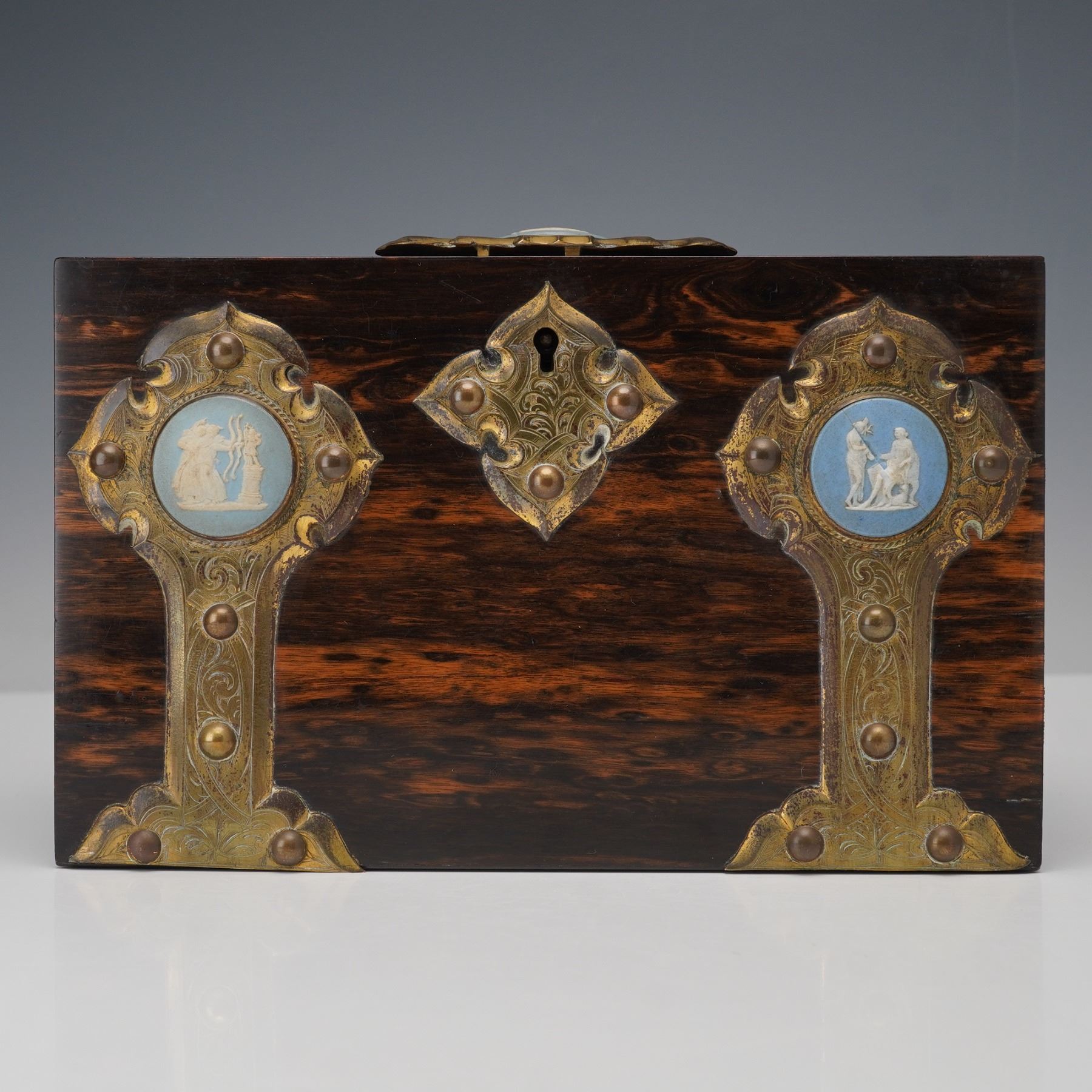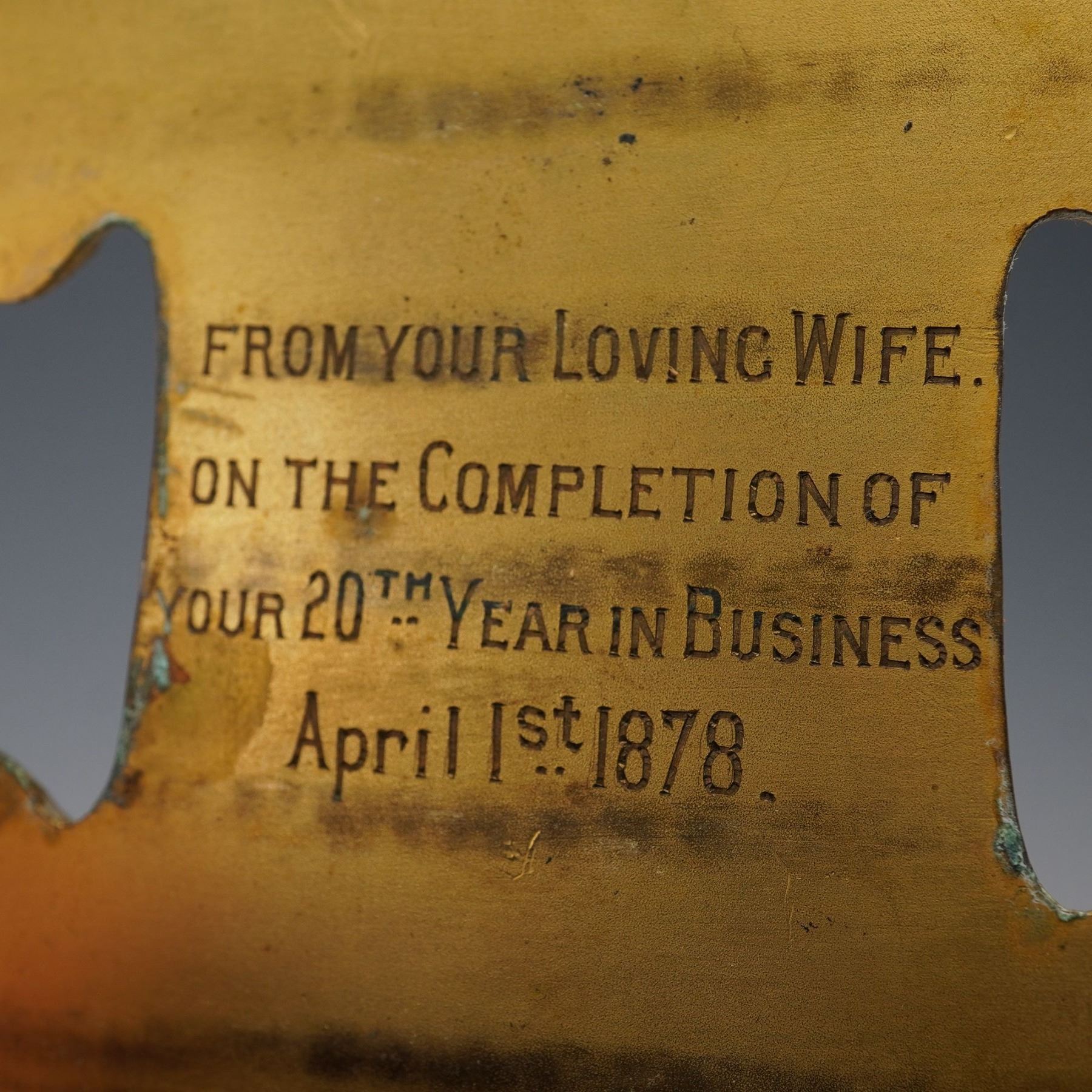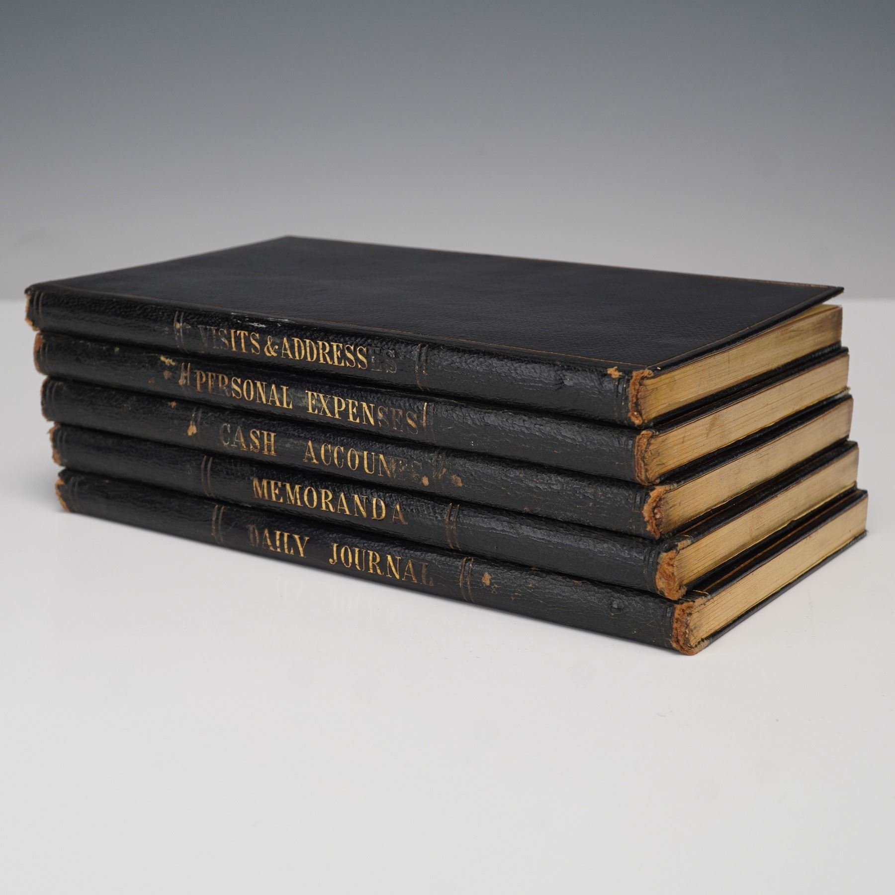 Inset with Wedgwood-style jasper plaques and enclosing five original ledgers titled "Daily Journal," "Memoranda," "Cash Accounts," "Visits & Addresses," and "Personal Expenses." The hinged interior is signed "Manoah Rhodes, Bradford" and features a presentation inscription reading "From your loving wife on the completion of your 20th year in business April 1st, 1878." The piece retains its original key.
