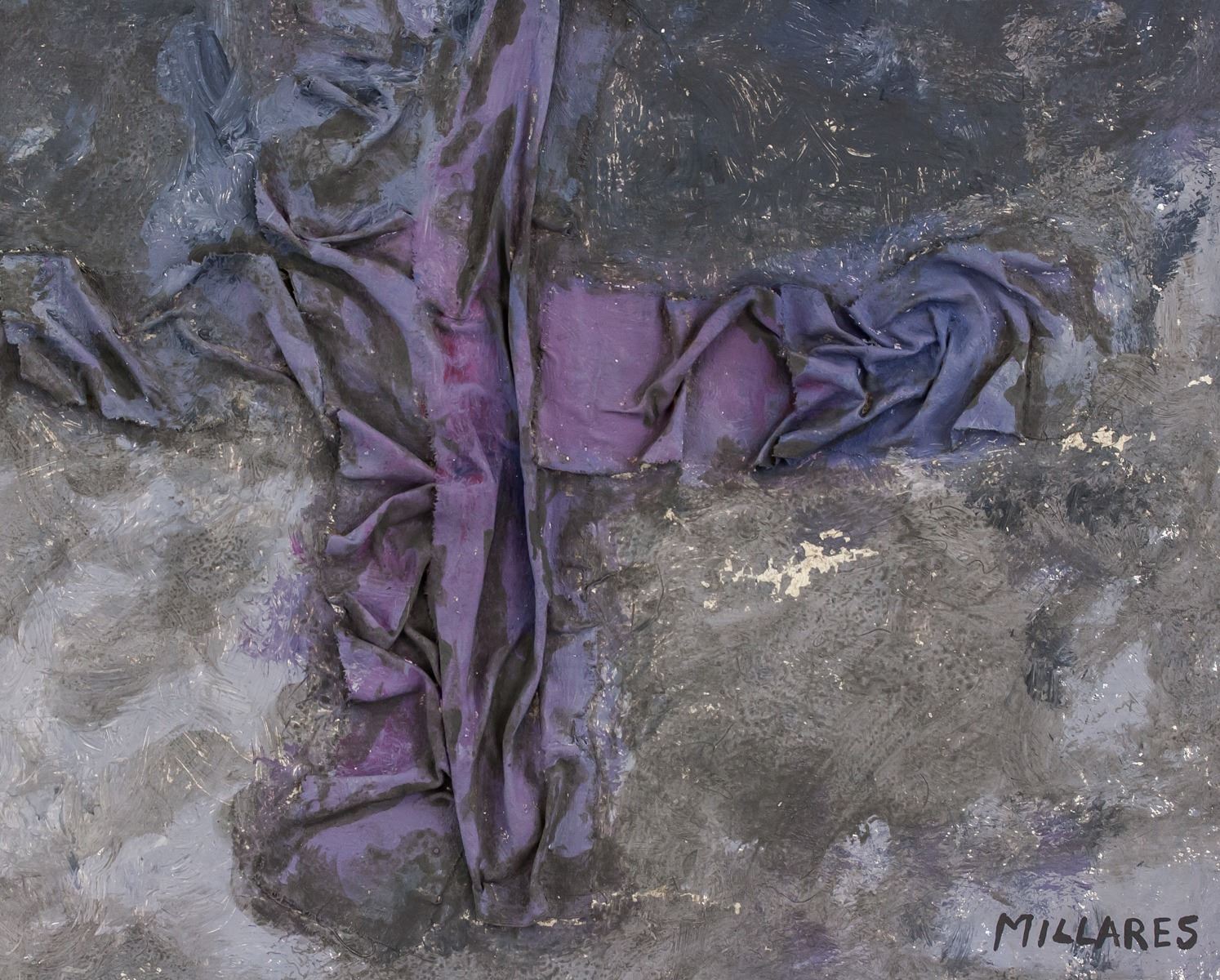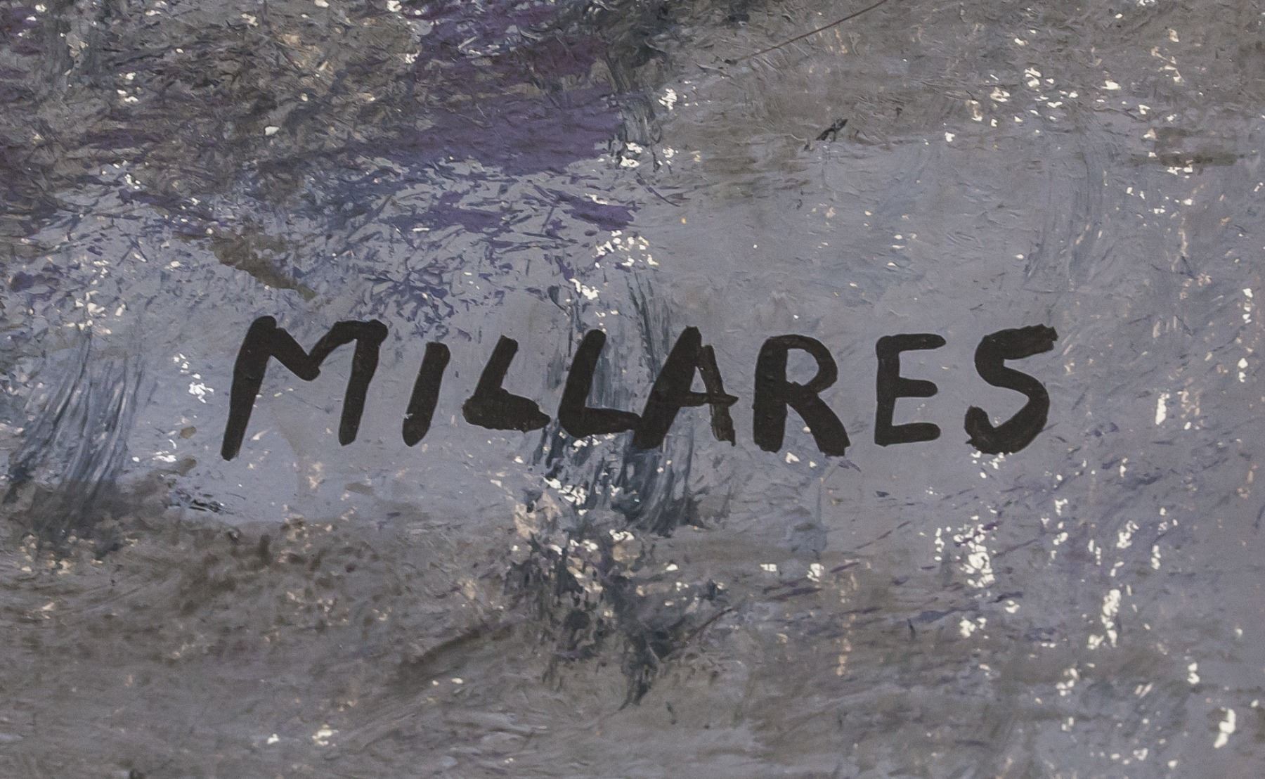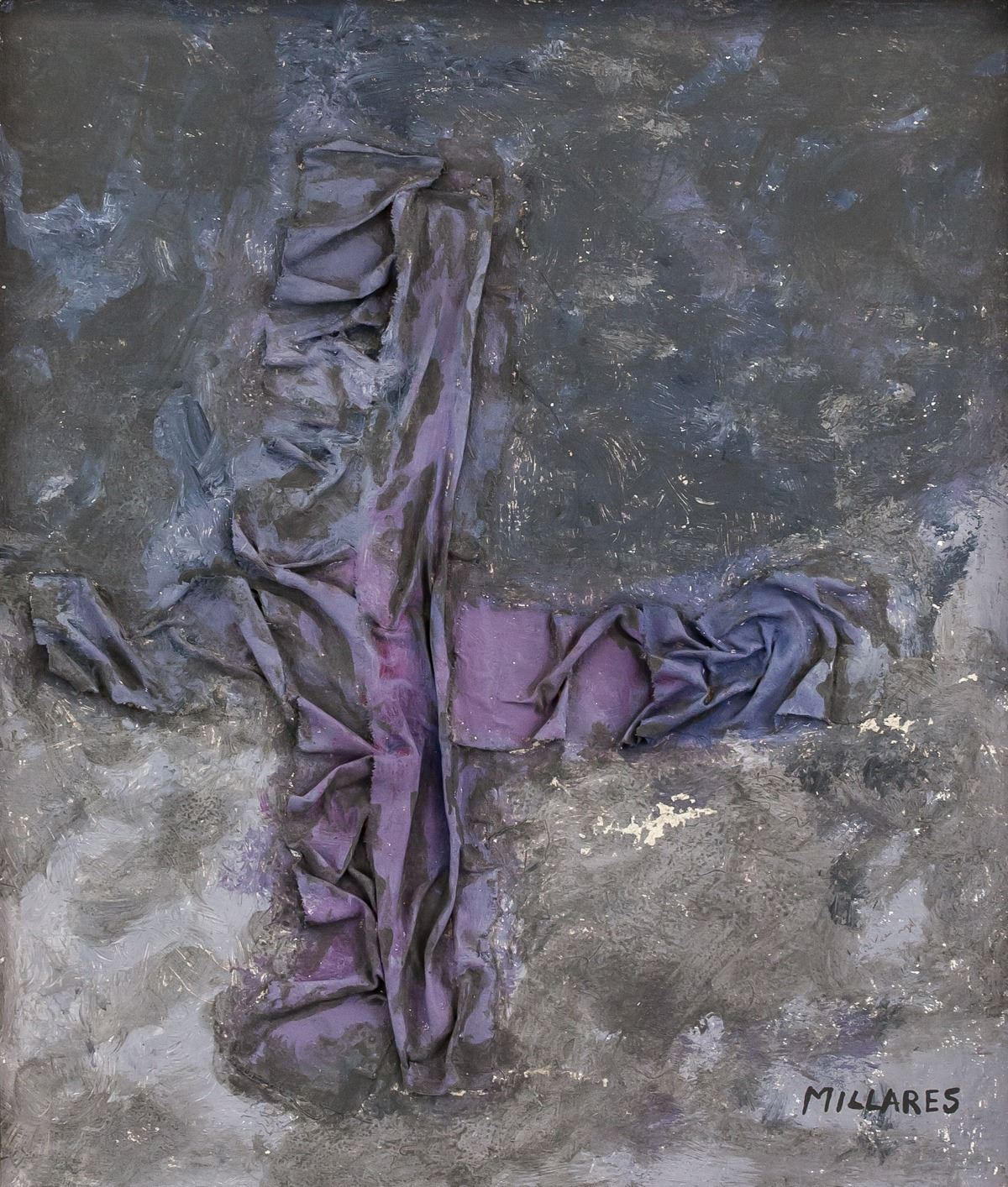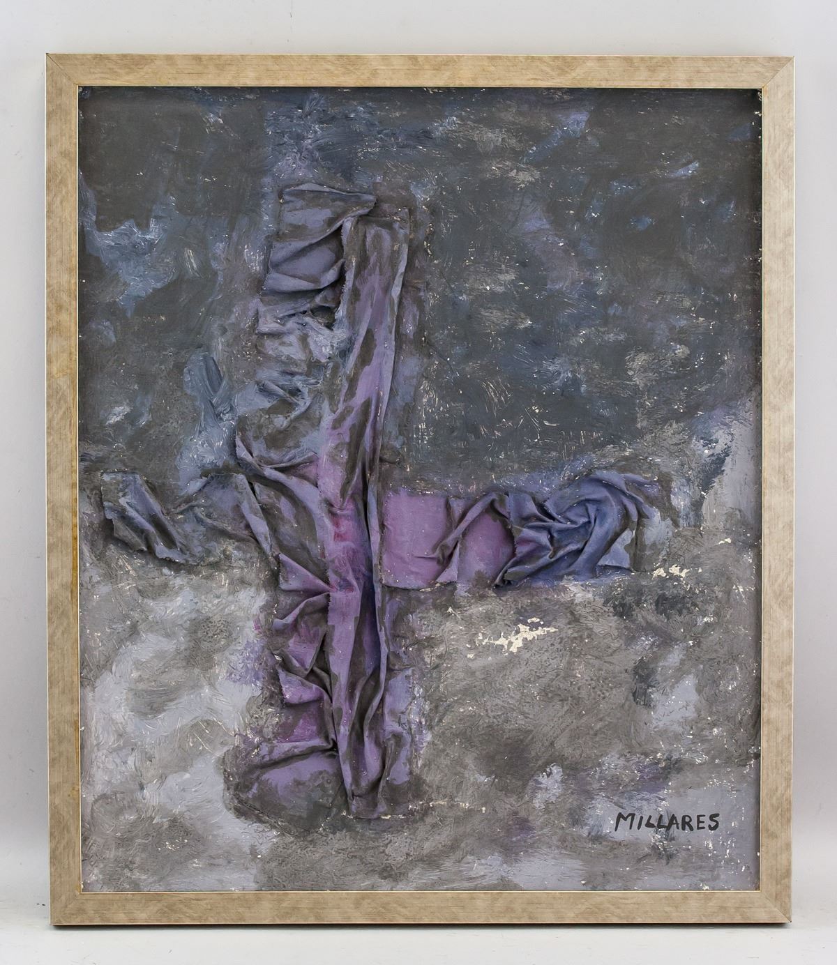 Mixed media on canvas. Featuring an abstract expressionist composition. Signed MILLARES on the lower right corner. Attributed Manolo Millares (1926-1972, Spanish). 48.5 x 41 cm (19 x 16 inches). Framed size: 20.75 x 17.75 inches). PROVENANCE: This lot carries limited provenance from a Southern Ontario estate