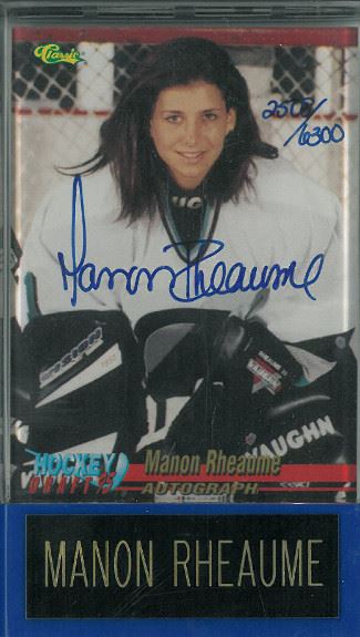 Manon Rheaume hand autographed 1993 Hockey Draft Autographed Card. Limited Edition of 6300. She was a Canadian goaltender, won an Olympic silver medal and is the only woman to play in the NHL, having played in two exhibition games for the Tampa Bay Lightning. Scoreboard Certificate of Authenticity Included as well as Deluxe Card Holder and Nameplate.