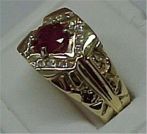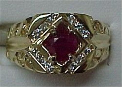 Man's 14k gold ruby and diamond ring; center section measures 1/2" by 1/2" and is set with round ruby surrounded by twelve diamonds approximately 3 points each; nugget design on sides of band; size 11; weight 5.2 dwt/8.2 grams (no visible defects) Estimat