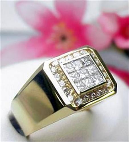 Man's 14kt yellow gold ring with invisible set princess cut diamonds and channel set round diamonds 1.53Ctw 15.1gr