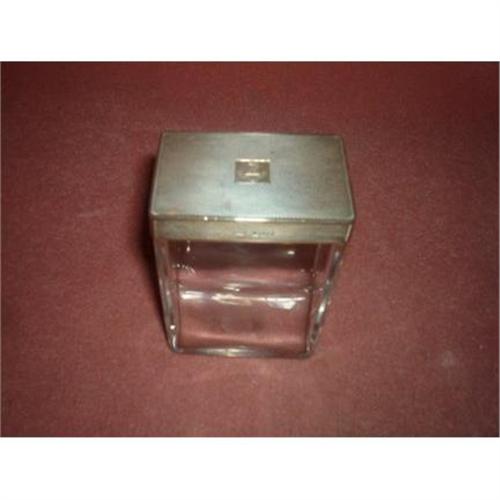 An English gentlemans dresser jar. Plain lead crystal base. Sterling engine turned lid hallmarked London 1950, bearing a griffon family crest with the words "sublimiora Peto" 3.5" tall X 2.5" wide X 1.5" deep. Art Deco in design.